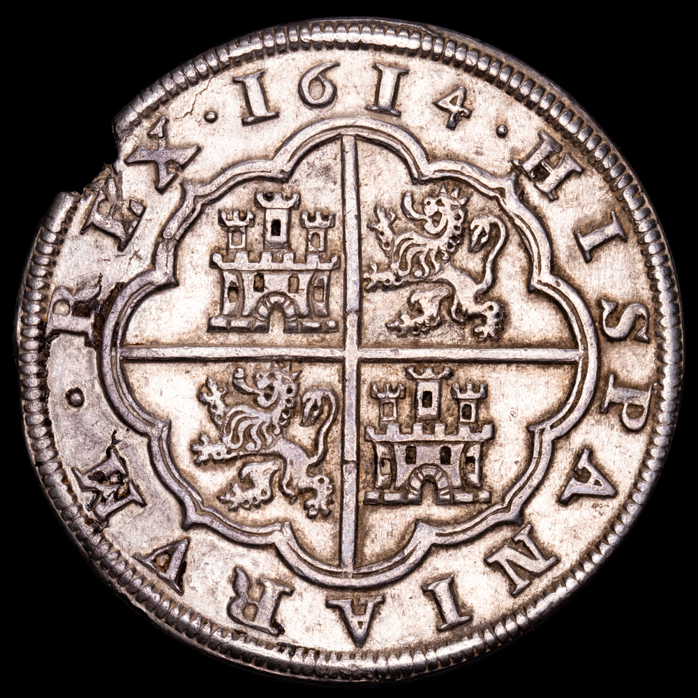 Felipe III. 8 Reales. (26,68 g.). Segovia. 1614. Ensayador A·R. AC-946. EBC-. Falta de metal. Muy rara.
