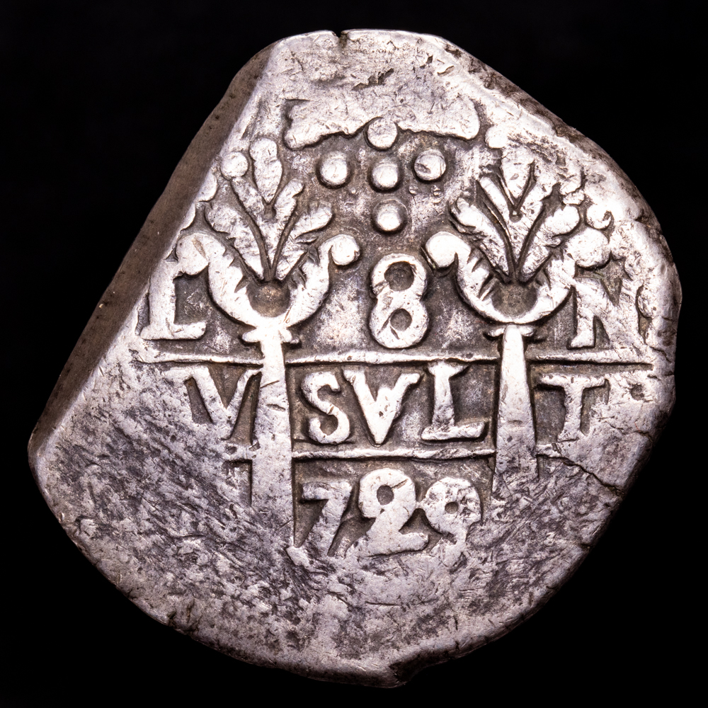 Felipe V. 8 Reales. (23,78 g.). Lima. 1729. Ensayador N. AC-1302. MBC. Cercenada. Dos fechas visibles