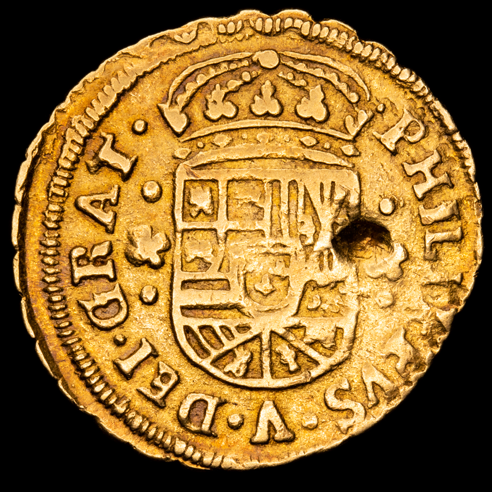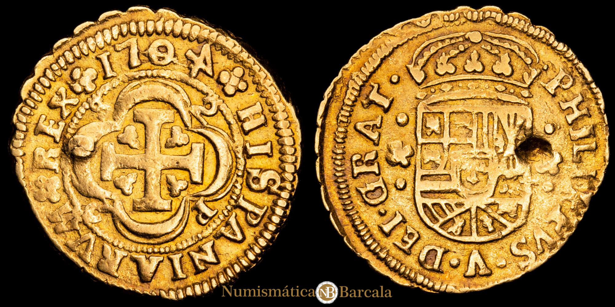 Numismática Barcala > Productos > Monarquia Española > Borbones > 1700-1746 Felipe V > Felipe V. 2 Escudos. (6,71 g.). Sevilla. 1704. Ensayador P. AC-1971. VF+. Variante con el 4 girado. Muy Rara.