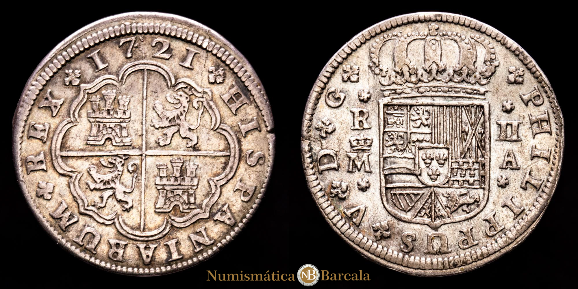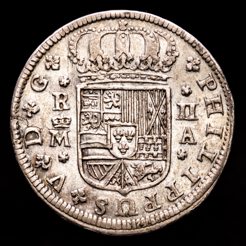 Numismática Barcala > Productos > Monarquia Española > Borbones > 1700-1746 Felipe V > Felipe V. 2 Reales. (4,88 g.). Madrid. 1721. Ensayador A. Aureo y Calicó-774. MBC+.