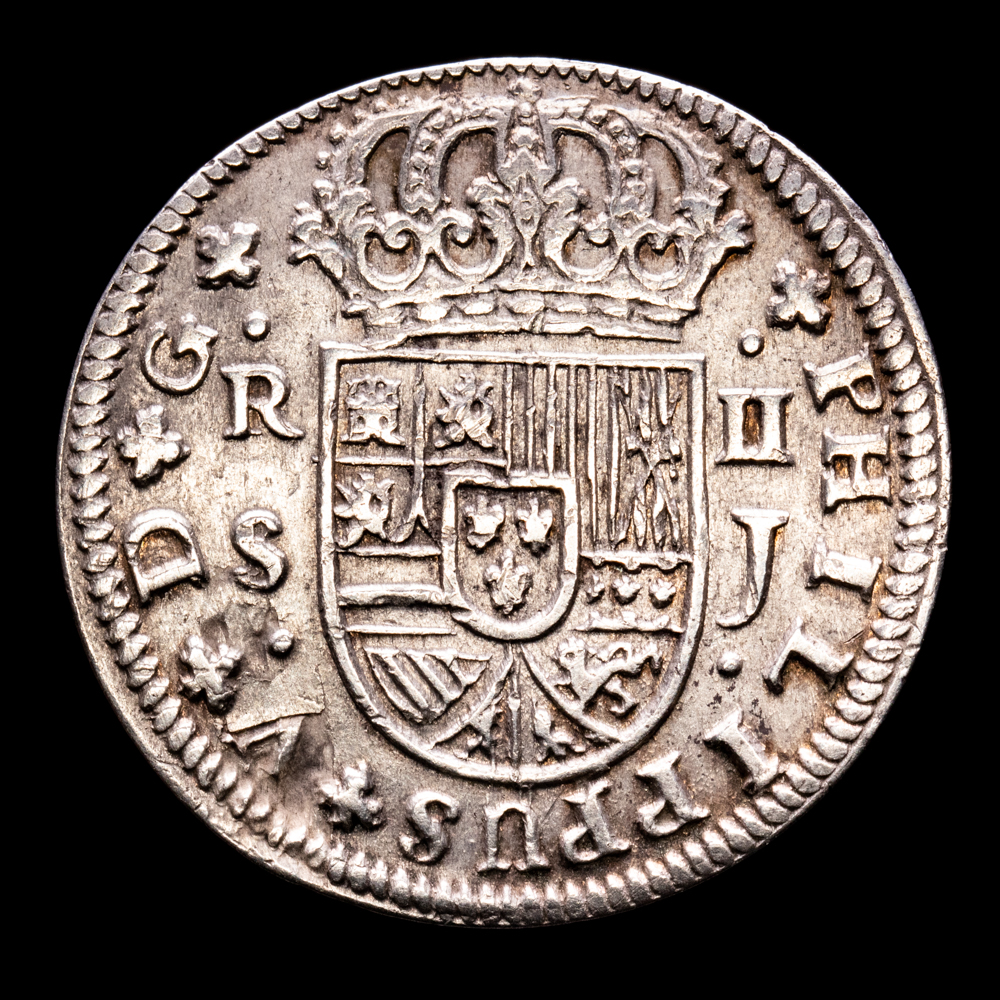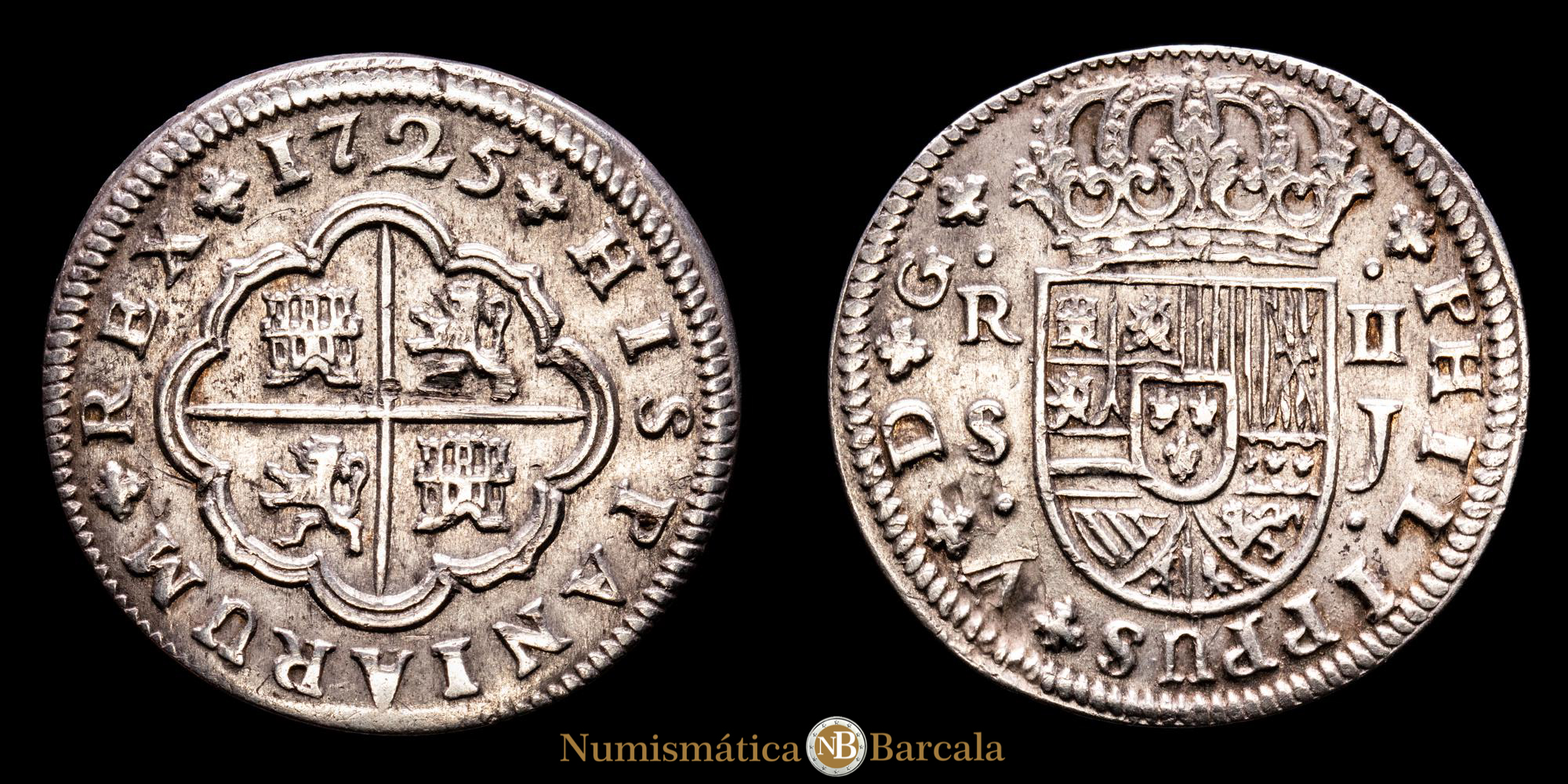 Numismática Barcala > Productos > Monarquia Española > Borbones > 1700-1746 Felipe V > Felipe V. 2 Reales. (5,45 g.). Sevilla. 1725. Aureo y Calicó – 983. EBC-.