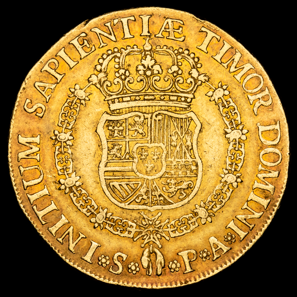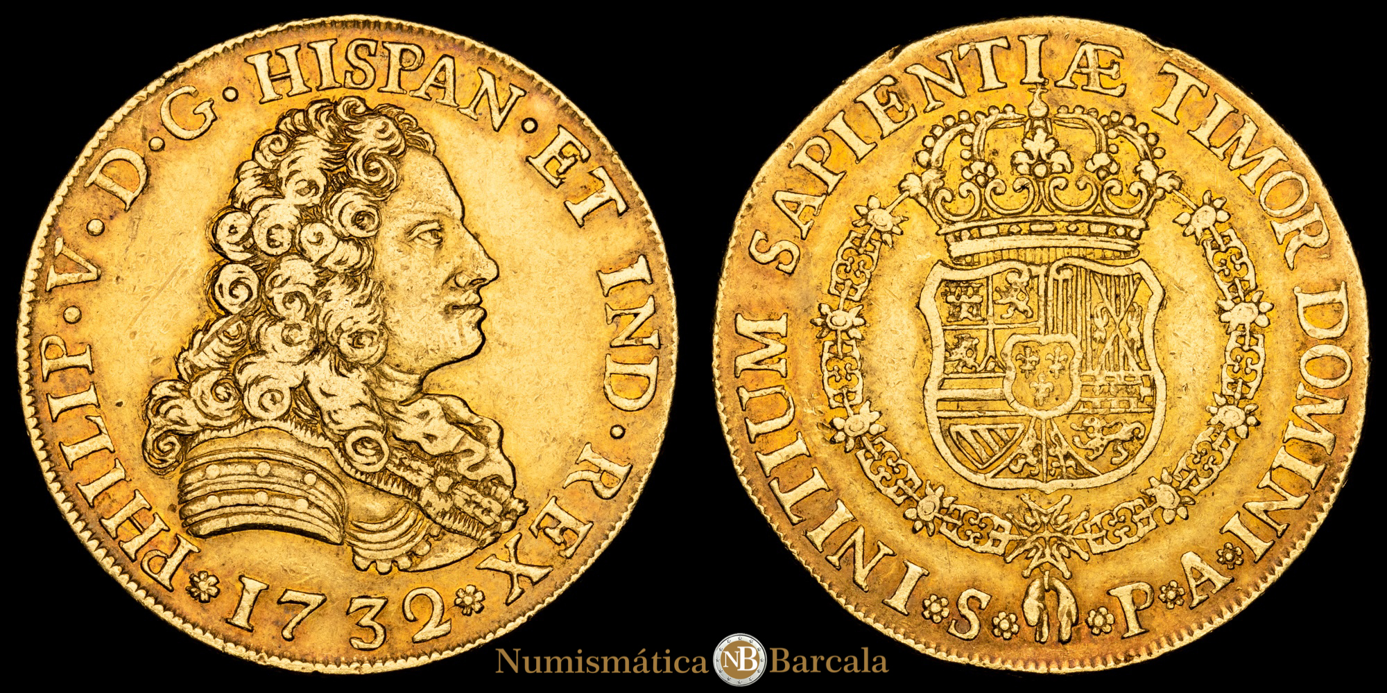 Numismática Barcala > Productos > Monarquia Española > Borbones > 1700-1746 Felipe V > Felipe V. 8 Escudos (27,00 g.). Sevilla. 1732. Ensayador P·A. Aureo y Calicó – 2307. MBC+. Bonito color.
