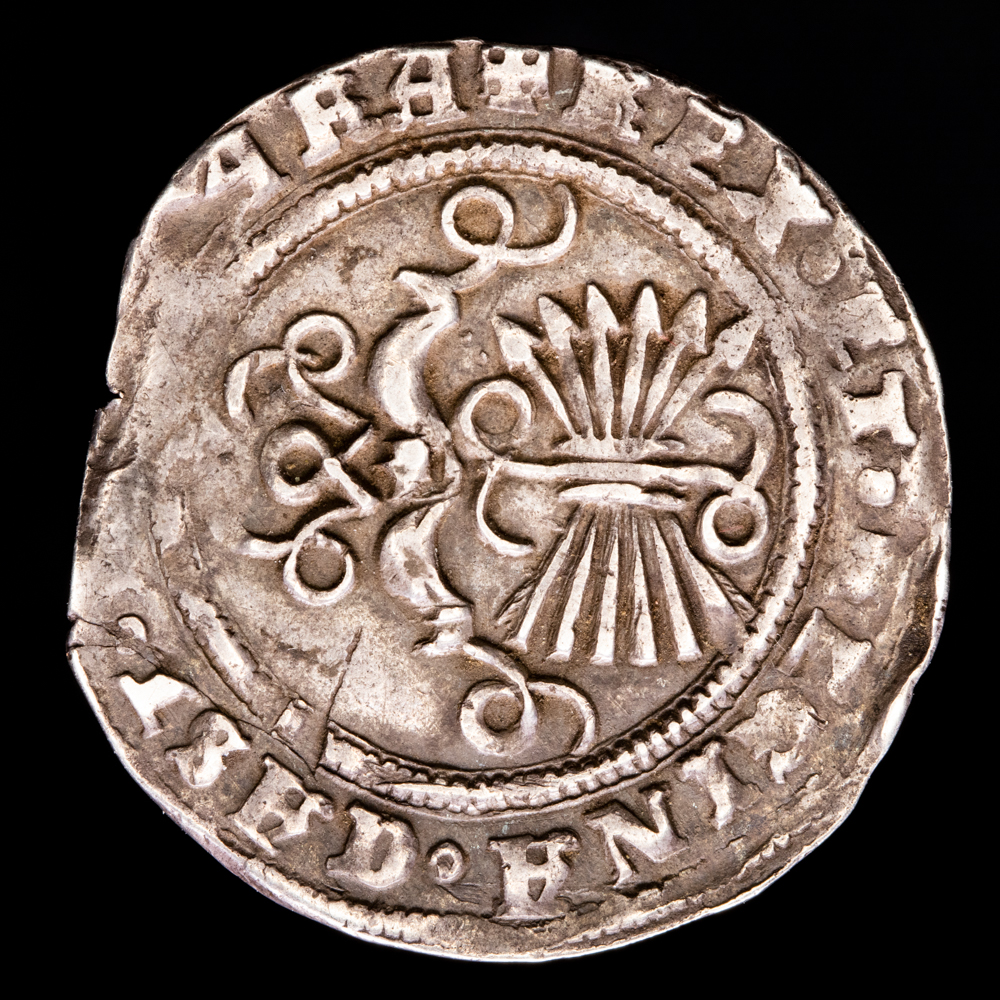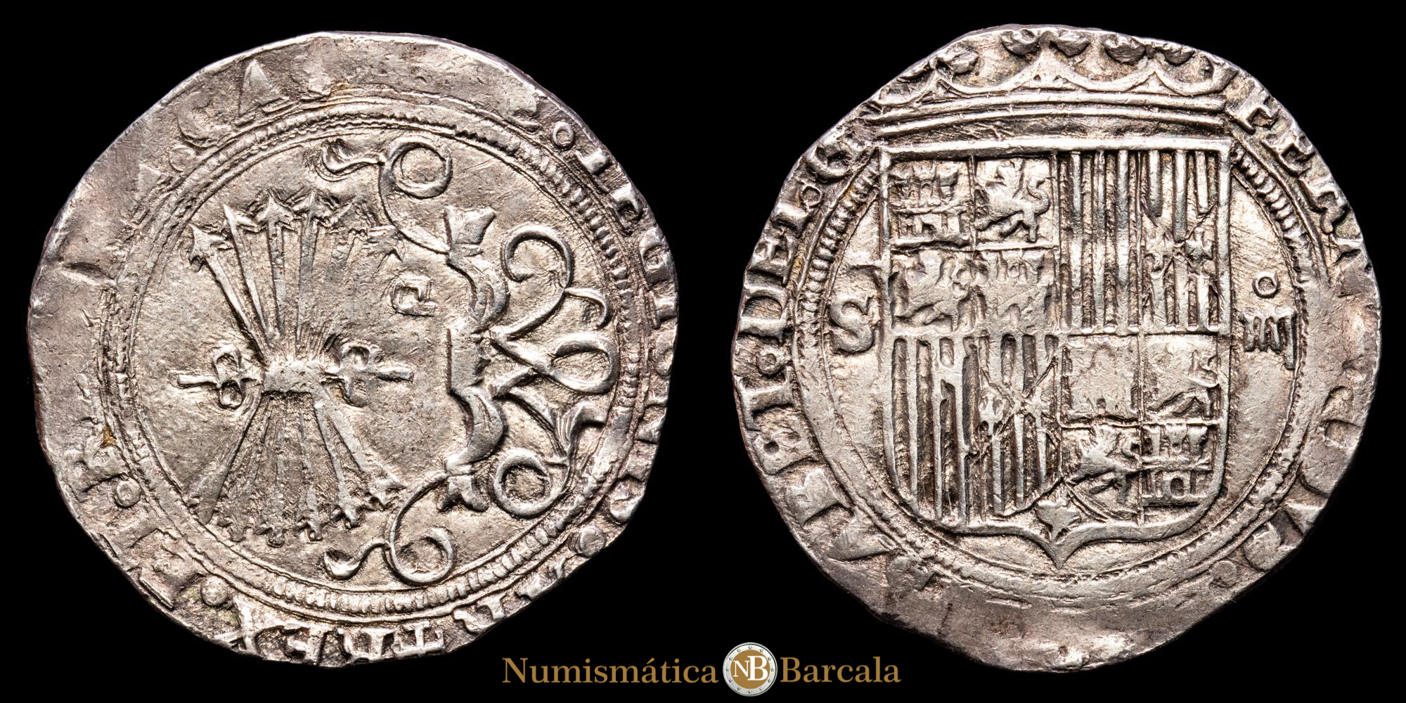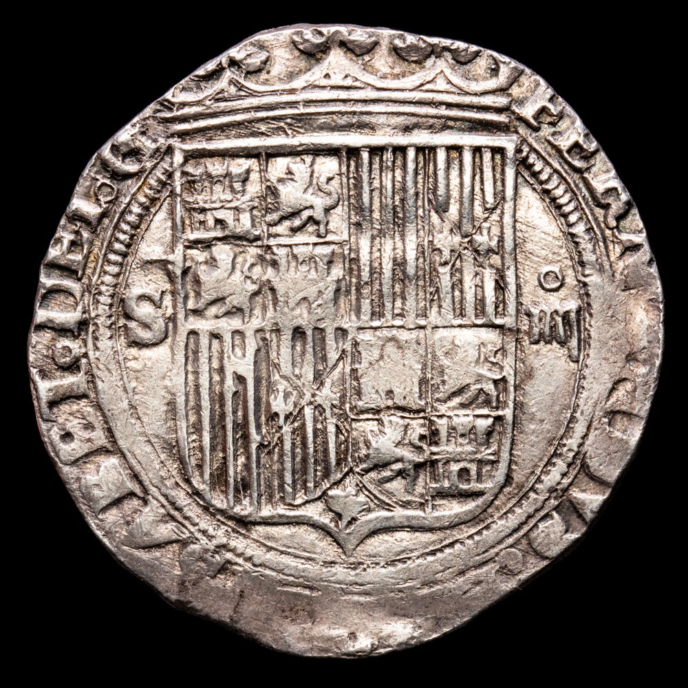 Numismática Barcala > Productos > Monarquia Española > Reyes católicos > Fernando e Isabel. 4 Reales. (13,81 g.). Sevilla. (1474-1504). Ensayador D “cuadrada”. Aureo y Calicó – 595. MBC+. Ensayador D cuadrada en reverso