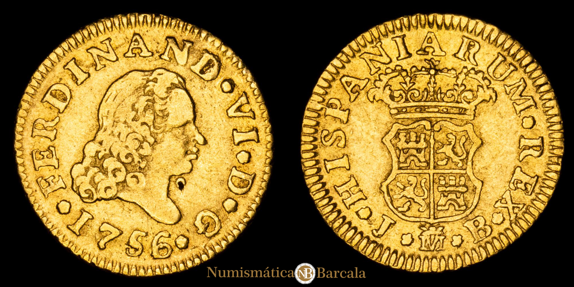 Numismática Barcala > Productos > Monarquia Española > Borbones > 1746-1759 Fernando VI > Fernando VI. 1/2 Escudo. (1,76g.). Madrid. 1756. Ensayador J·B. AC-559. MBC.