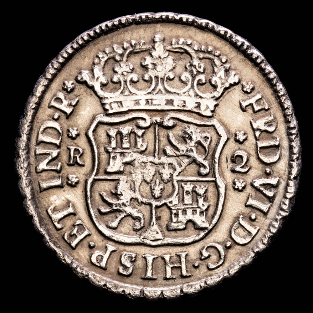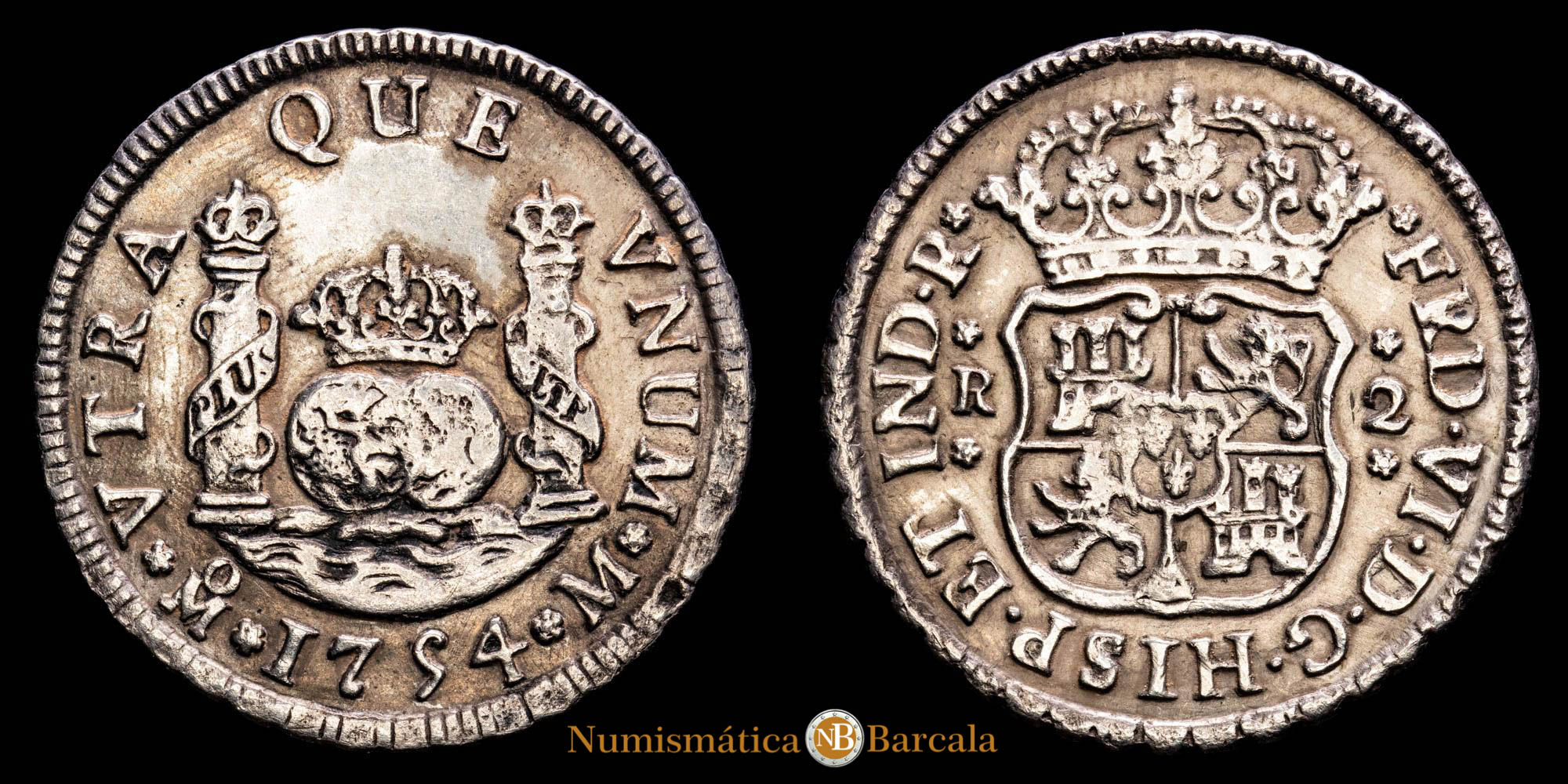 Numismática Barcala > Productos > Monarquia Española > Borbones > 1746-1759 Fernando VI > Fernando VI. 2 Reales. (5,96 g.). México. 1754. Ensayador M. Aureo y Calicó – 295. MBC+. Tipo columnario.