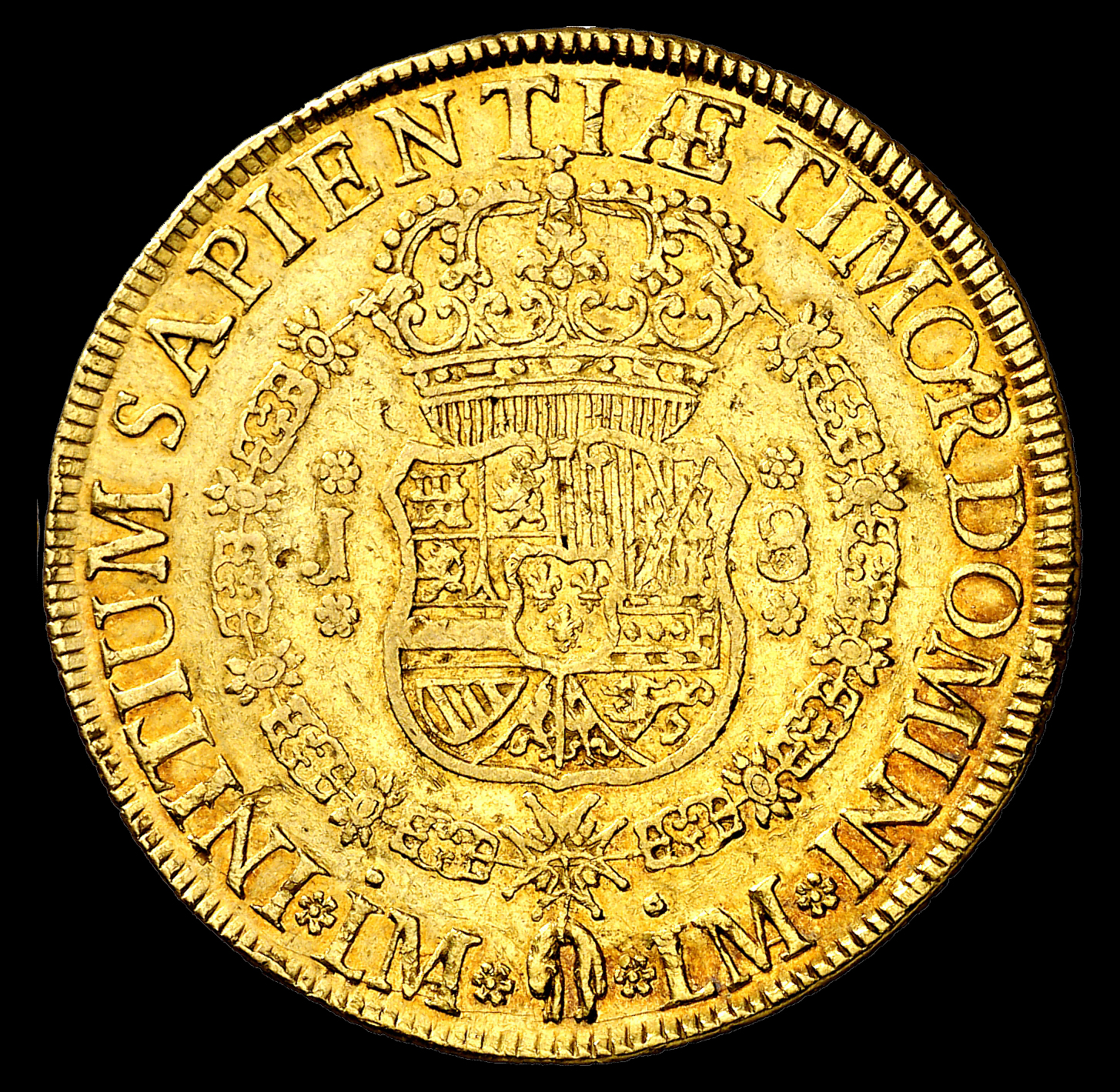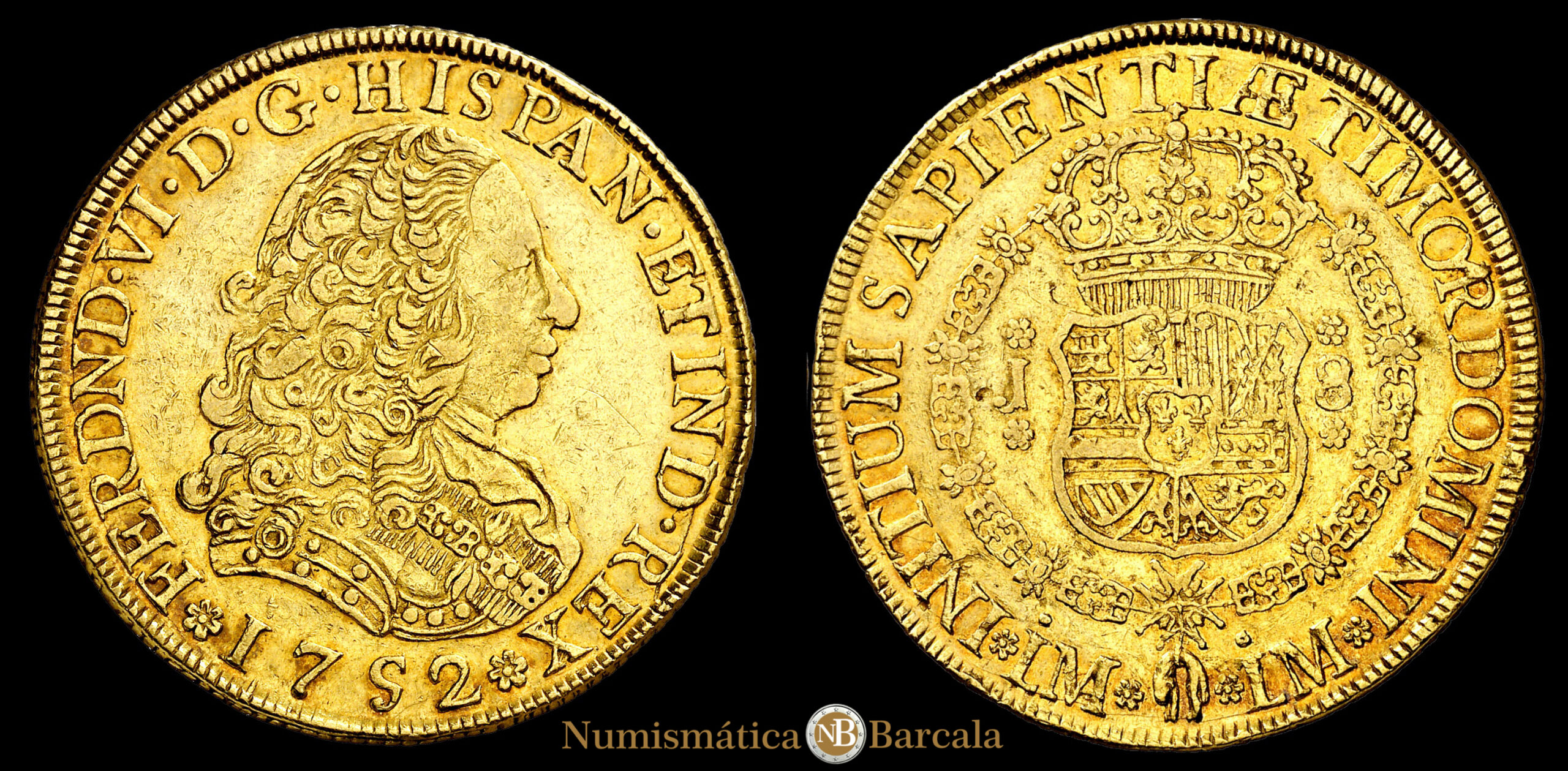 Numismática Barcala > Productos > Monarquia Española > Borbones > 1746-1759 Fernando VI > Fernando VI. 8 Escudos (26,83 g.). Lima, 1752. Ensayador J. AC-765. EBC-. Muy escasa. Precioso color.