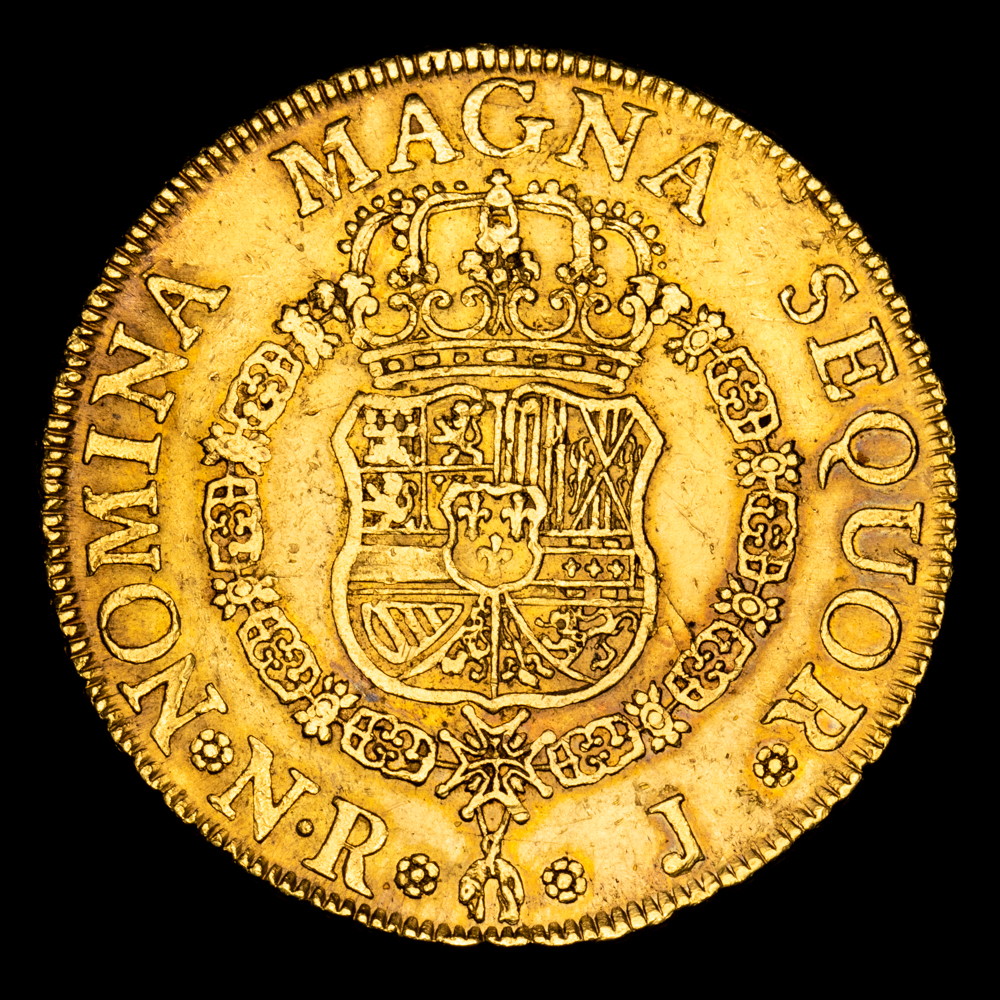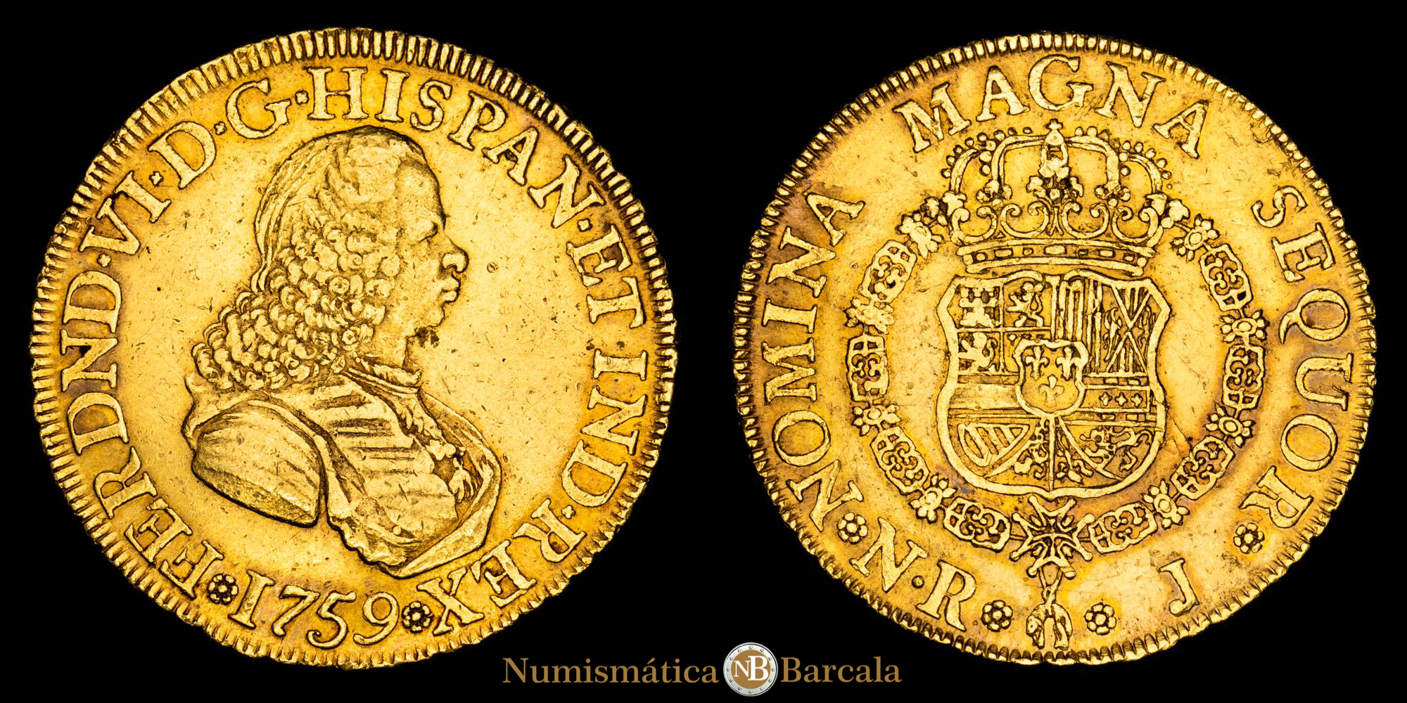 Numismática Barcala > Productos > Monarquia Española > Borbones > 1746-1759 Fernando VI > Fernando VI. 8 Escudos . (27,04 g.). Nuevo Reino. 1759. Ensayador J. Aureo y Calico-797. MBC+. Rara! Bello color.