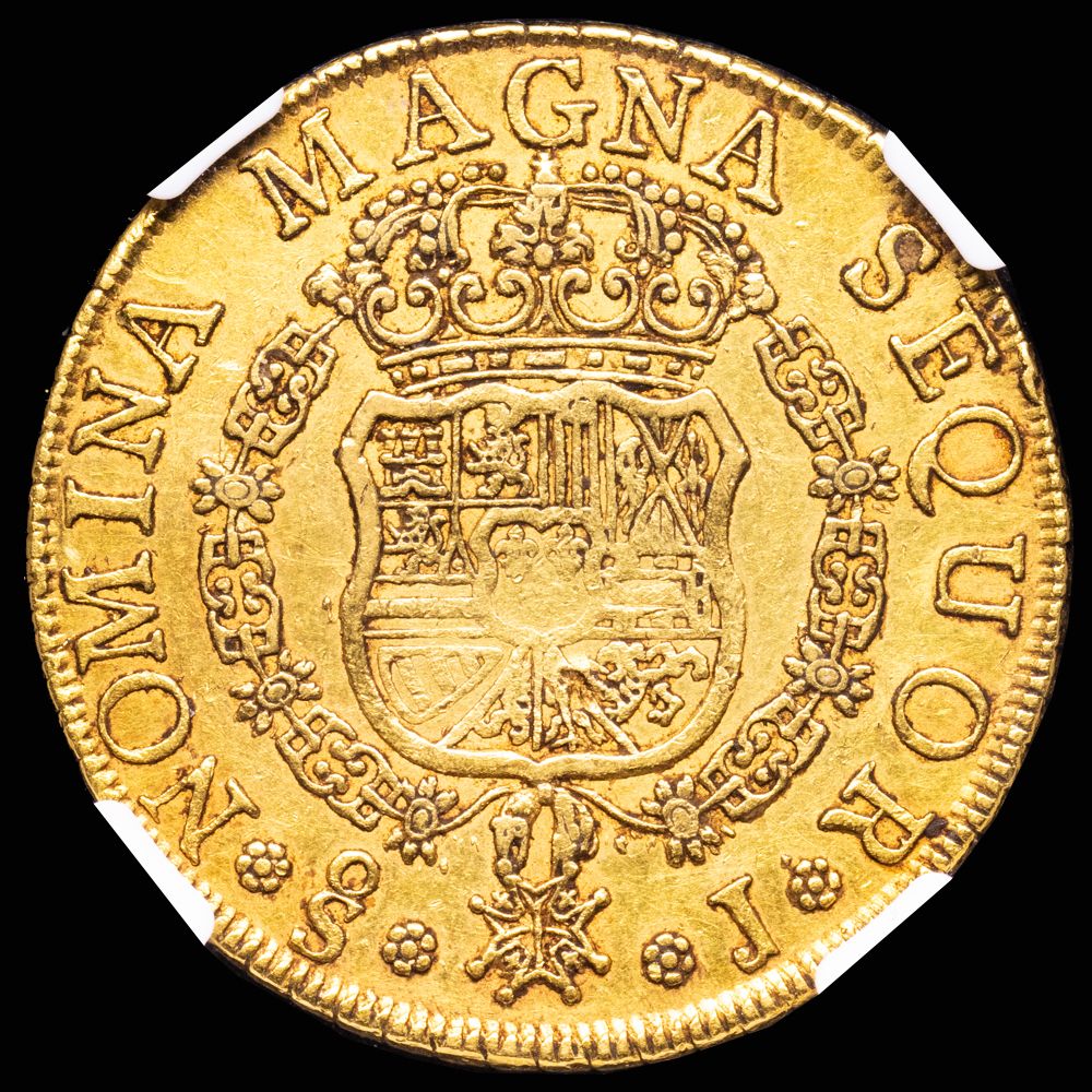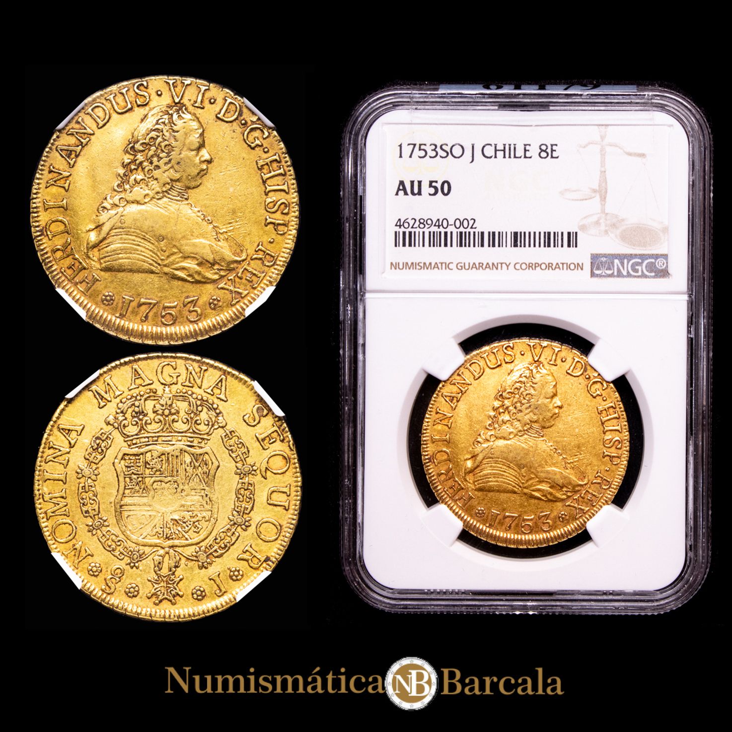 Numismática Barcala > Productos > Monarquia Española > Borbones > 1746-1759 Fernando VI > Fernando VI. 8 Escudos. Santiago de Chile, 1753. Ensayador J. Cal-827. Cal onza-646. Rara. Encapsulada por la NGC, AU50.