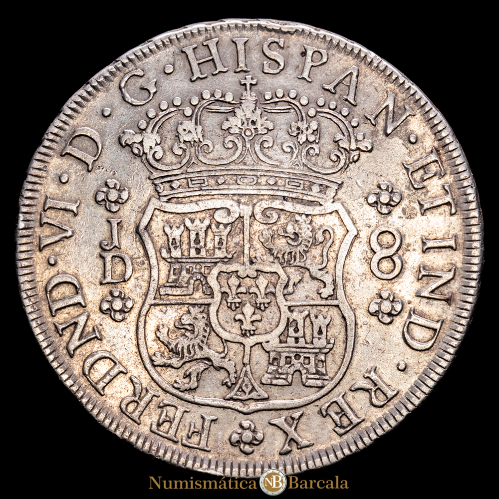 Numismática Barcala > Productos > Monarquia Española > Borbones > 1746-1759 Fernando VI > Fernando VI. 8 Reales. (26,93 g.). Lima. 1754. Ensayador J·D. AC-457. VF+. Punto sobre las dos L