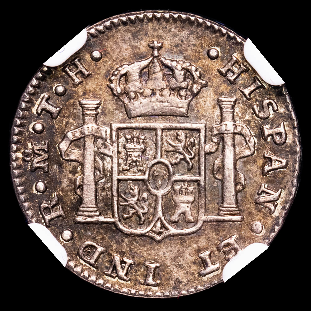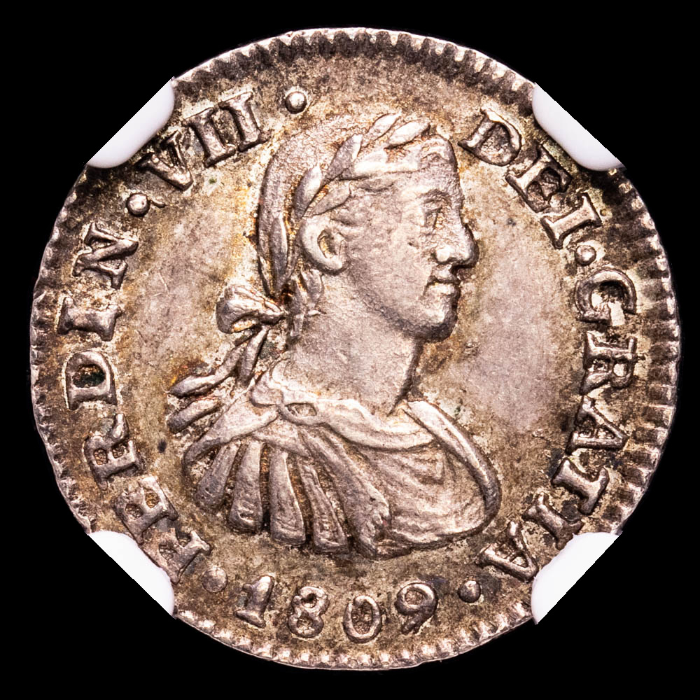 Fernando VII. 1/2 Real. México. 1809. Ensayador T·H. (Aureo&Calicó 390) . Encapsulado por NGC AU-58. Una pieza sana y encantadora con un hermoso tono gris intenso en todas partes. Ligeramente circulado pero aún conserva gran parte de su originalidad.