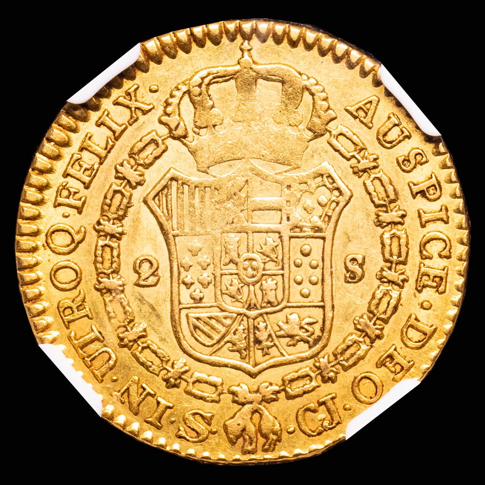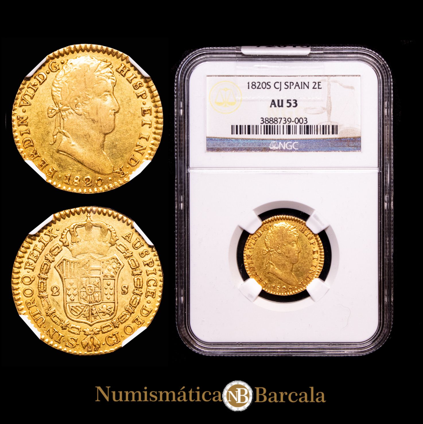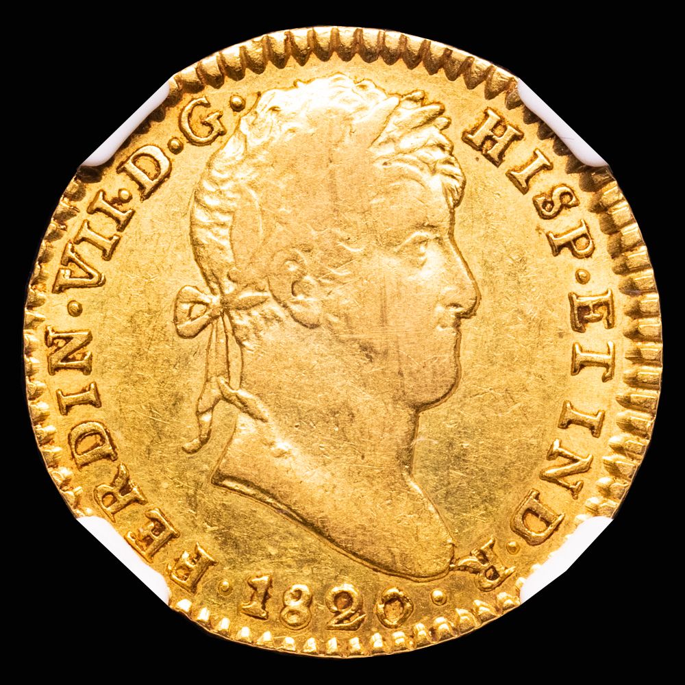 Numismática Barcala > Productos > Monarquia Española > Borbones > 1808-1833 Fernando VII > Fernando VII. 2 Escudos. Sevilla, 1820. Ensayador C·J. AC-1676. Encapsulada por la NGC, AU 53.