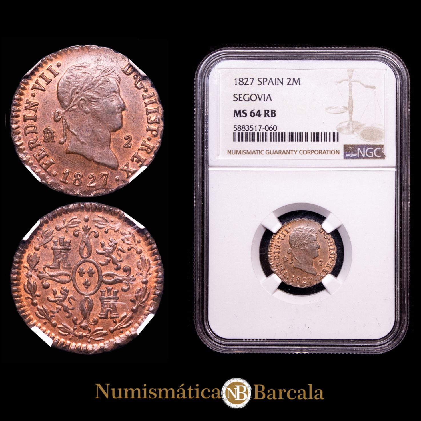 Numismática Barcala > Productos > Monarquia Española > Borbones > 1808-1833 Fernando VII > Fernando VII. 2 Maravedís. Segovia, 1827. AC-149. Encapsulada por la NGC MS 64 RB.