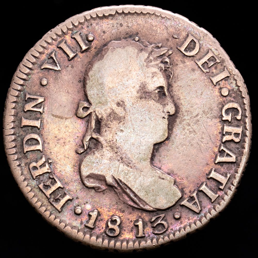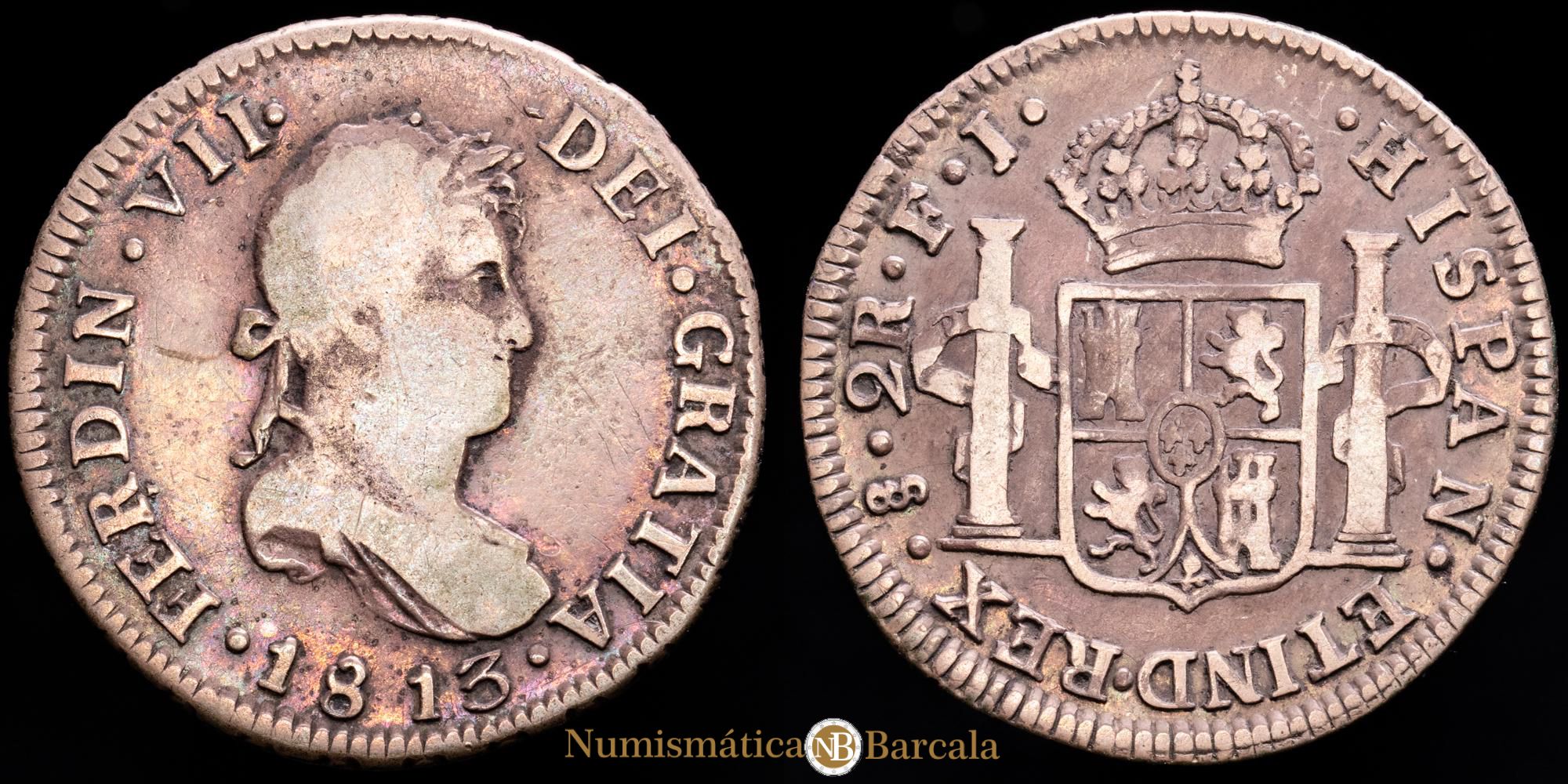 Numismática Barcala > Productos > Monarquia Española > Borbones > 1808-1833 Fernando VII > Fernando VII. 2 Reales. (6,71 g.). Santiago de Chile. 1813. Ensayador F·J. AC-943. MBC-. Escasa