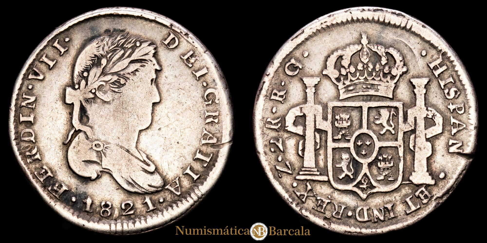 Numismática Barcala > Productos > Monarquia Española > Borbones > 1808-1833 Fernando VII > Fernando VII. 2 Reales. (7,47g.). Zacatecas. 1821. Ensayador R·G. AC-1014. MBC.