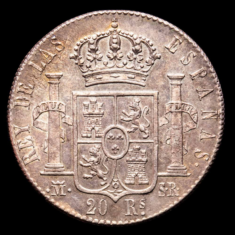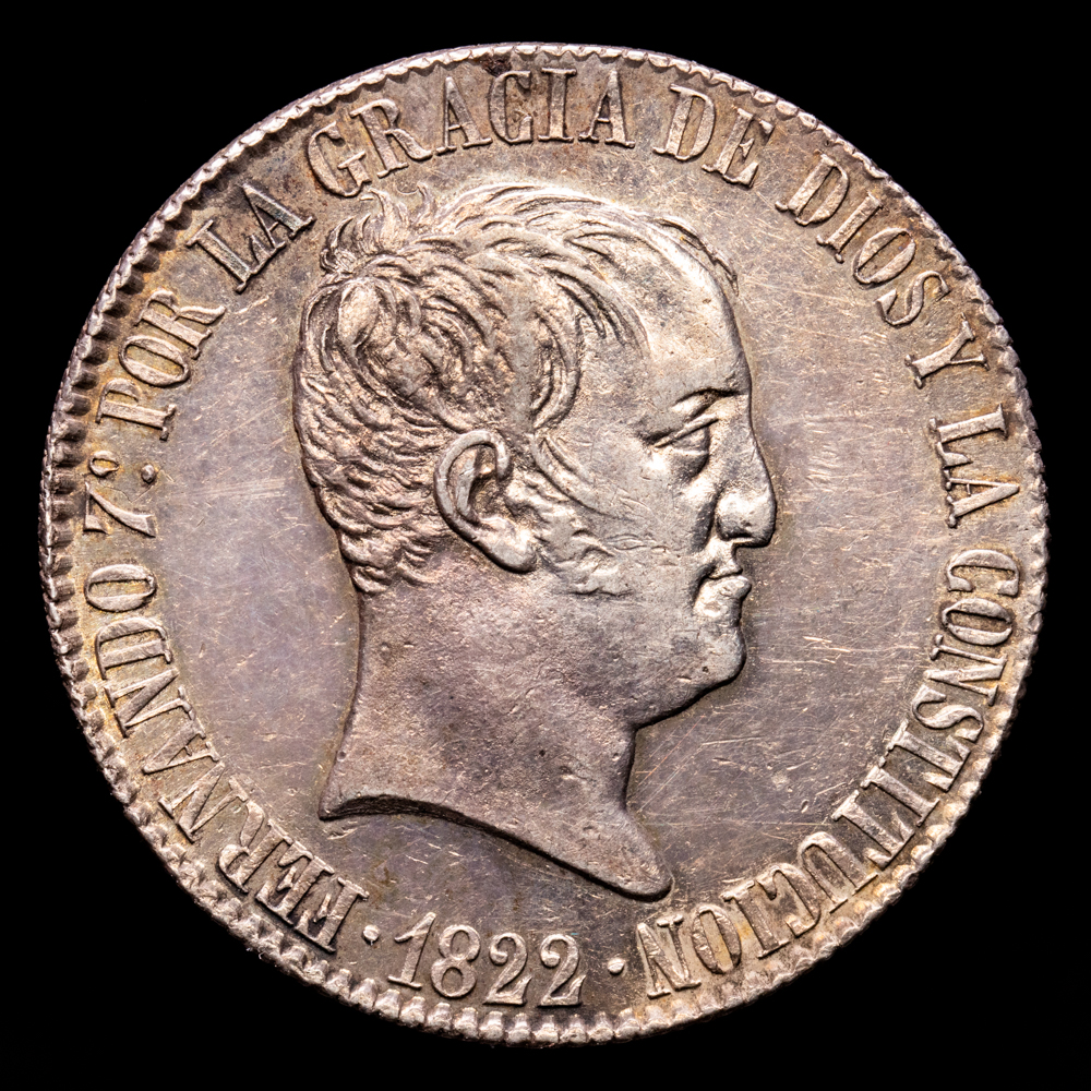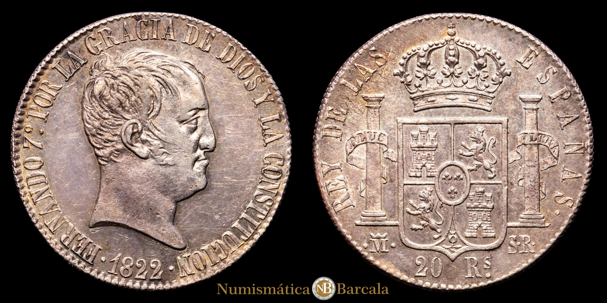Numismática Barcala > Productos > Monarquia Española > Borbones > 1808-1833 Fernando VII > Fernando VII. 20 Reales. (26,86 g.). Madrid. 1822. Ensayador S·R. Aureo y Calicó-1282. EBC+. Rara. Tipo “cabezón” Tono