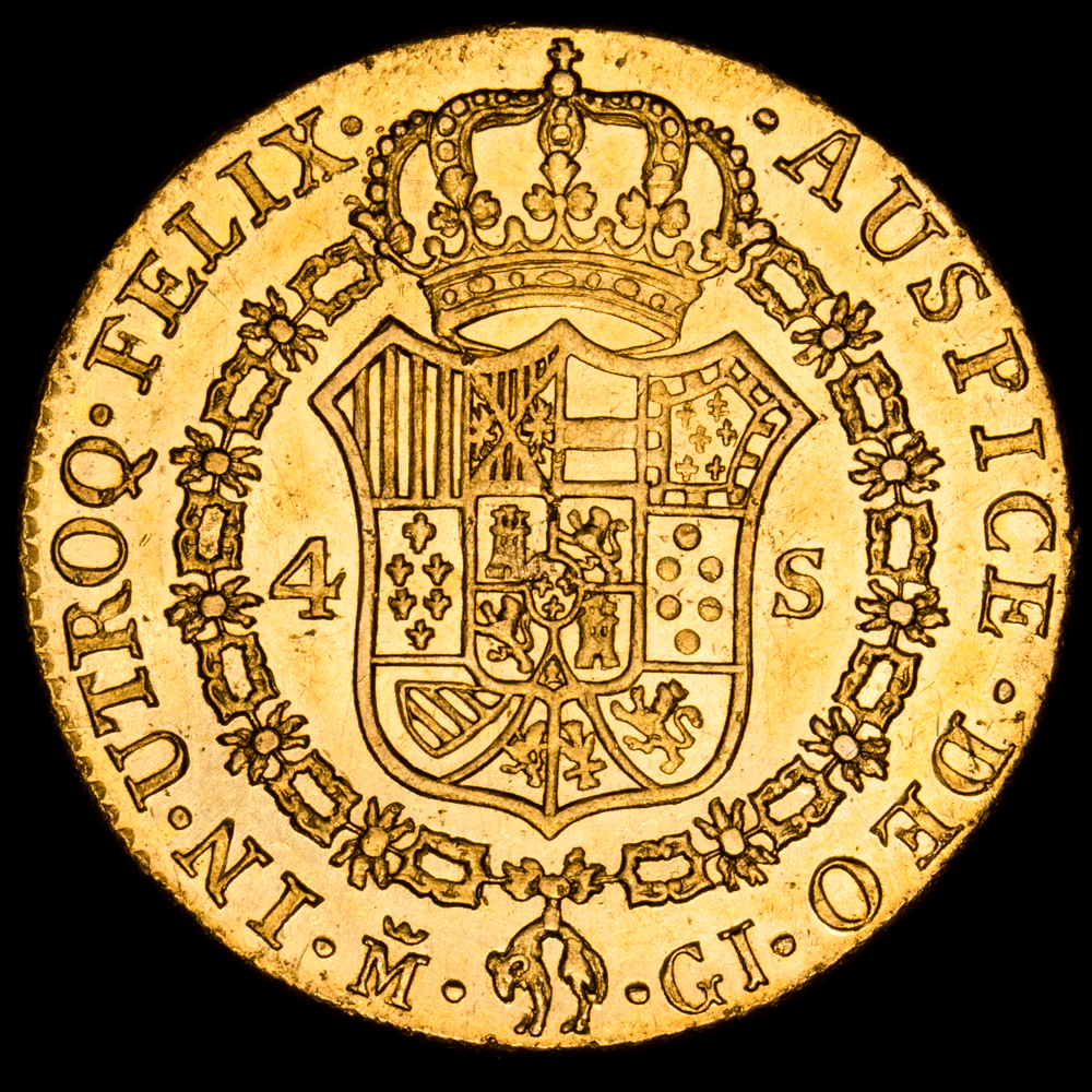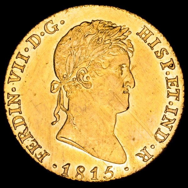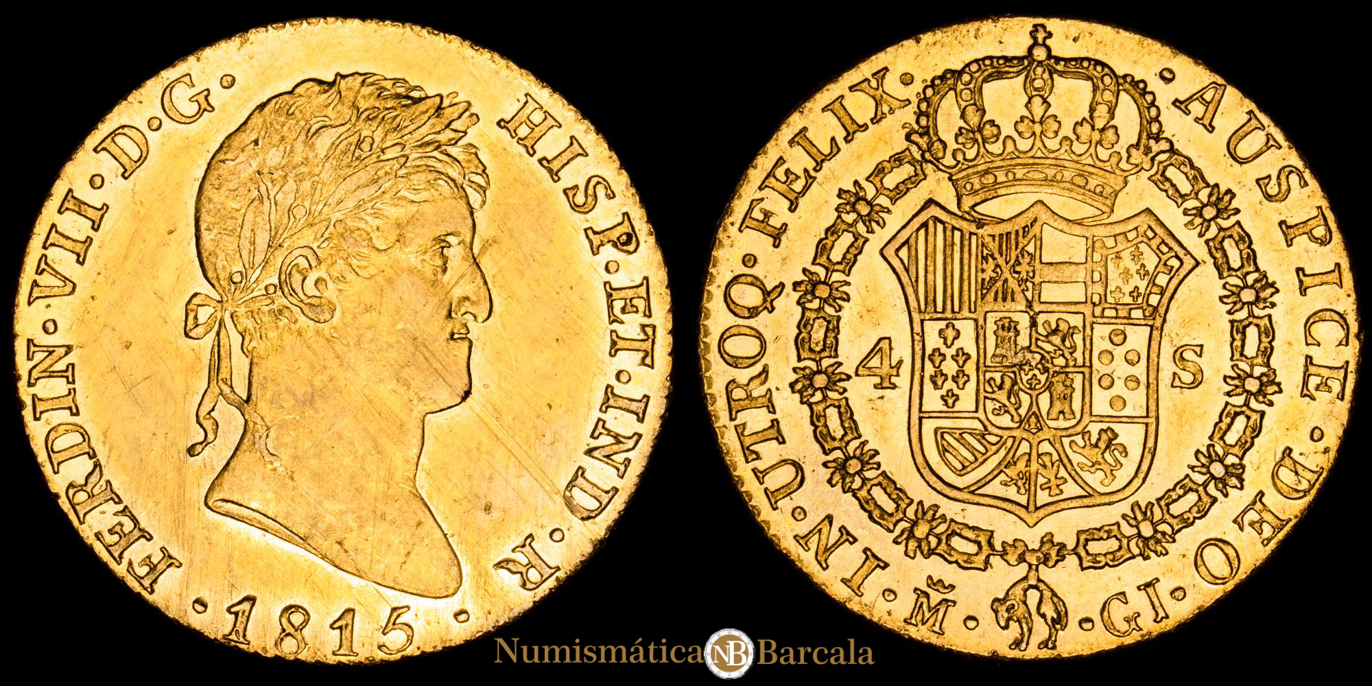 Fernando VII. 4 Escudos. (13,55 g.). Madrid. 1815. Ensayador G·J. AC-1710. EBC+. Restos de brillo original. Rayas en anverso.
