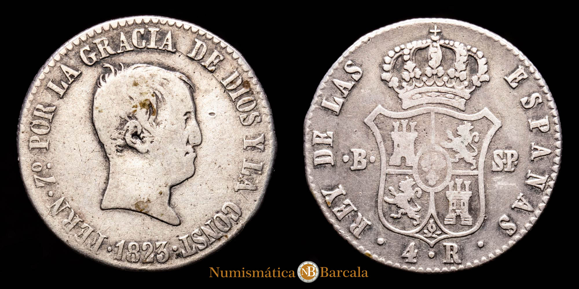 Numismática Barcala > Productos > Monarquia Española > Borbones > 1808-1833 Fernando VII > Fernando VII. 4 Reales. (5,78 g.). Barcelona. 1823. Ensayador S·P. Aureo y Calicó – 722. BC+. Rara.