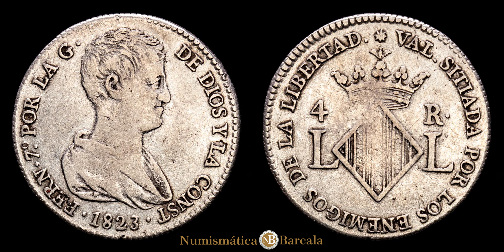 Numismática Barcala > Productos > Monarquia Española > Borbones > 1808-1833 Fernando VII > Fernando VII. 4 Reales. (6,23 g.). Valencia. 1823. Aureo y Calicó-994. MBC. Escasa