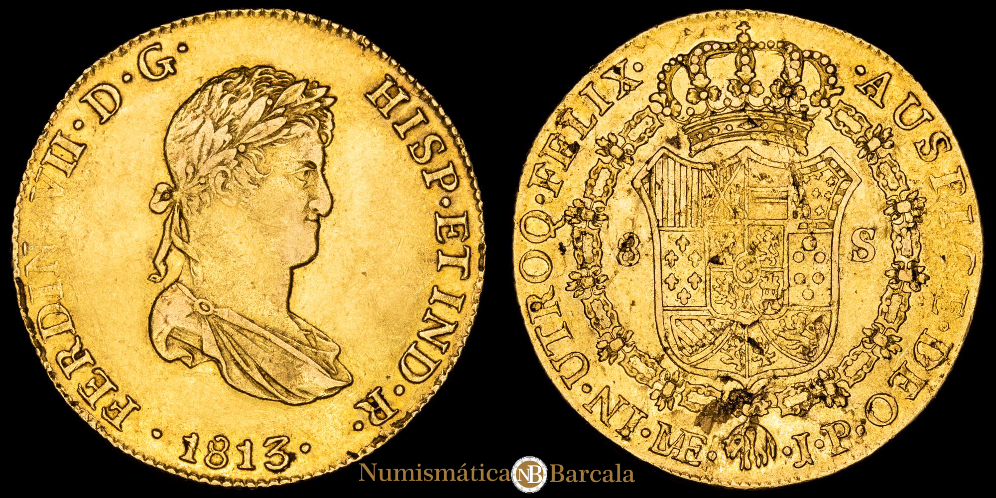 Numismática Barcala > Productos > Monarquia Española > Borbones > 1808-1833 Fernando VII > Fernando VII. 8 Escudos. (26,91g.). Lima. 1813. Ensayador J·P. AC-1760. VF+. Busto pequeño.