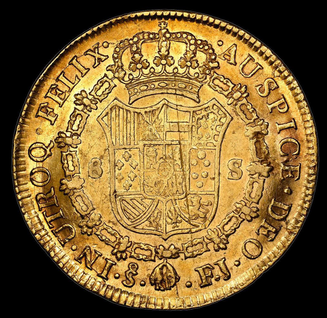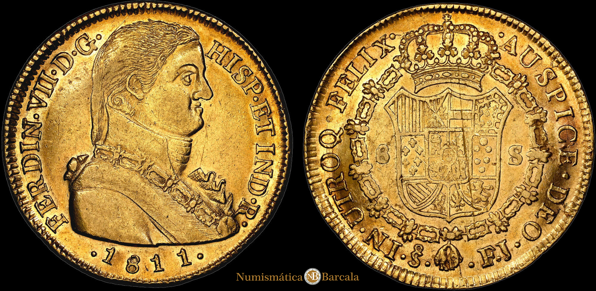 Fernando VII. 8 Escudos (26,98 g.). Santiago de Chile. 1811. Ensayador F·J. AC-1865. EBC. Restos de brillo original. Hojita en reverso. Precioso color .