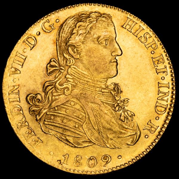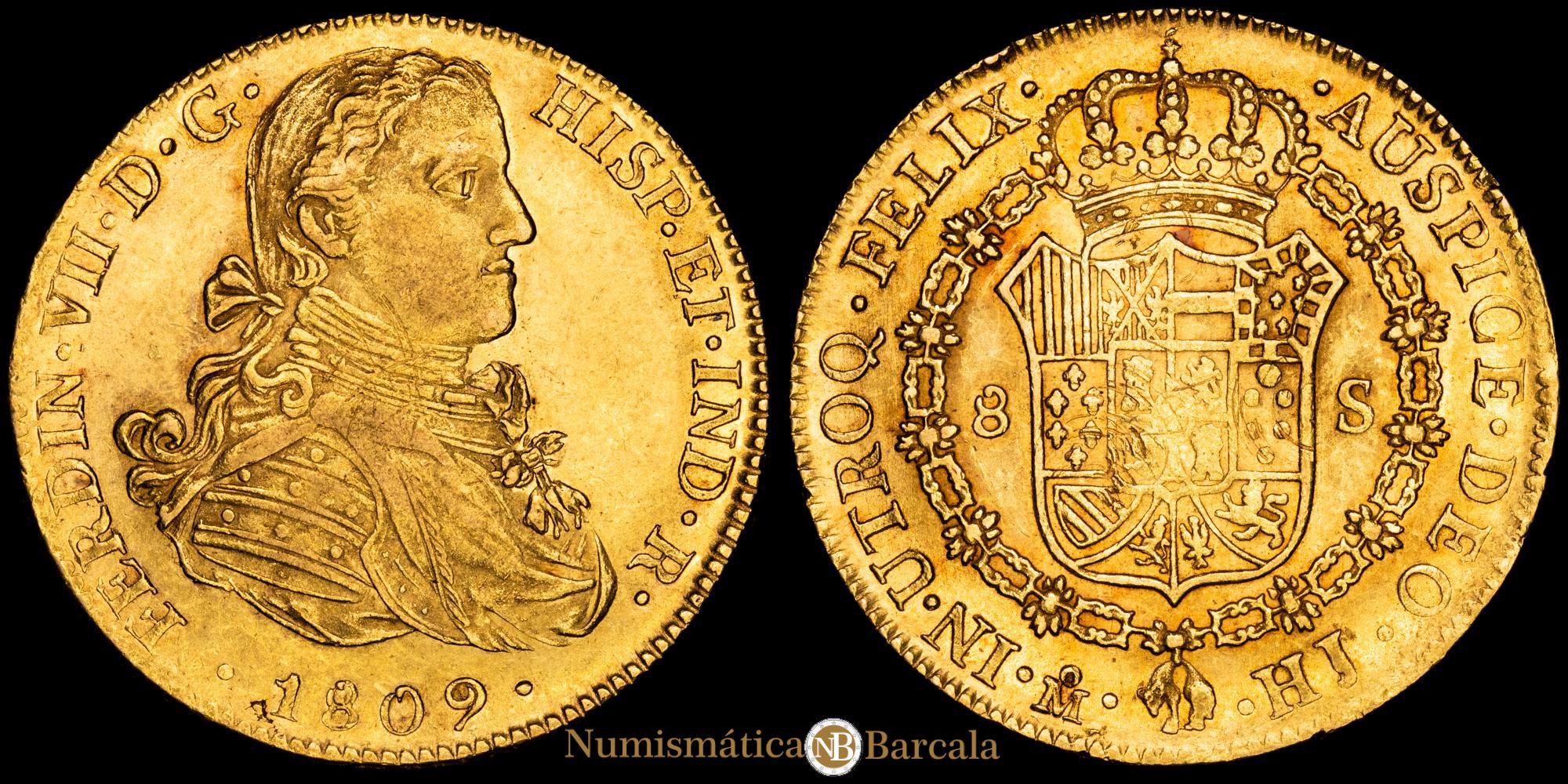 Numismática Barcala > Productos > Monarquia Española > Borbones > 1808-1833 Fernando VII > Fernando VII. 8 Escudos (27,06 g.). México. 1809. Ensayador H·J. C-16366. EBC+. Restos de brillo original. Buen ejemplar.
