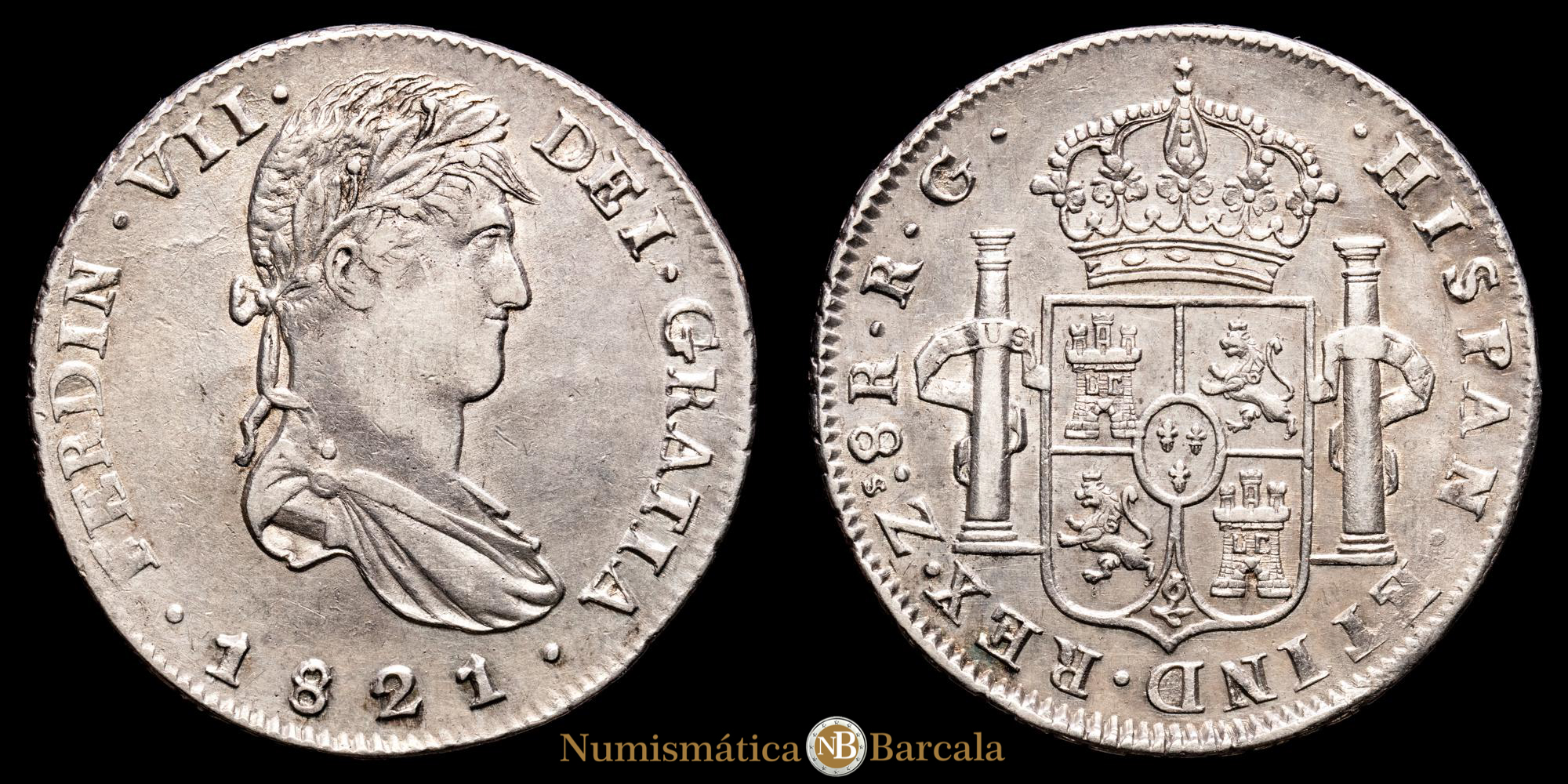 Numismática Barcala > Productos > Monarquia Española > Borbones > 1808-1833 Fernando VII > Fernando VII. 8 Reales. (27,07 g.). Zacatecas. 1821. Ensayador R·G. Aureo y Calicó-1465. MBC+.
