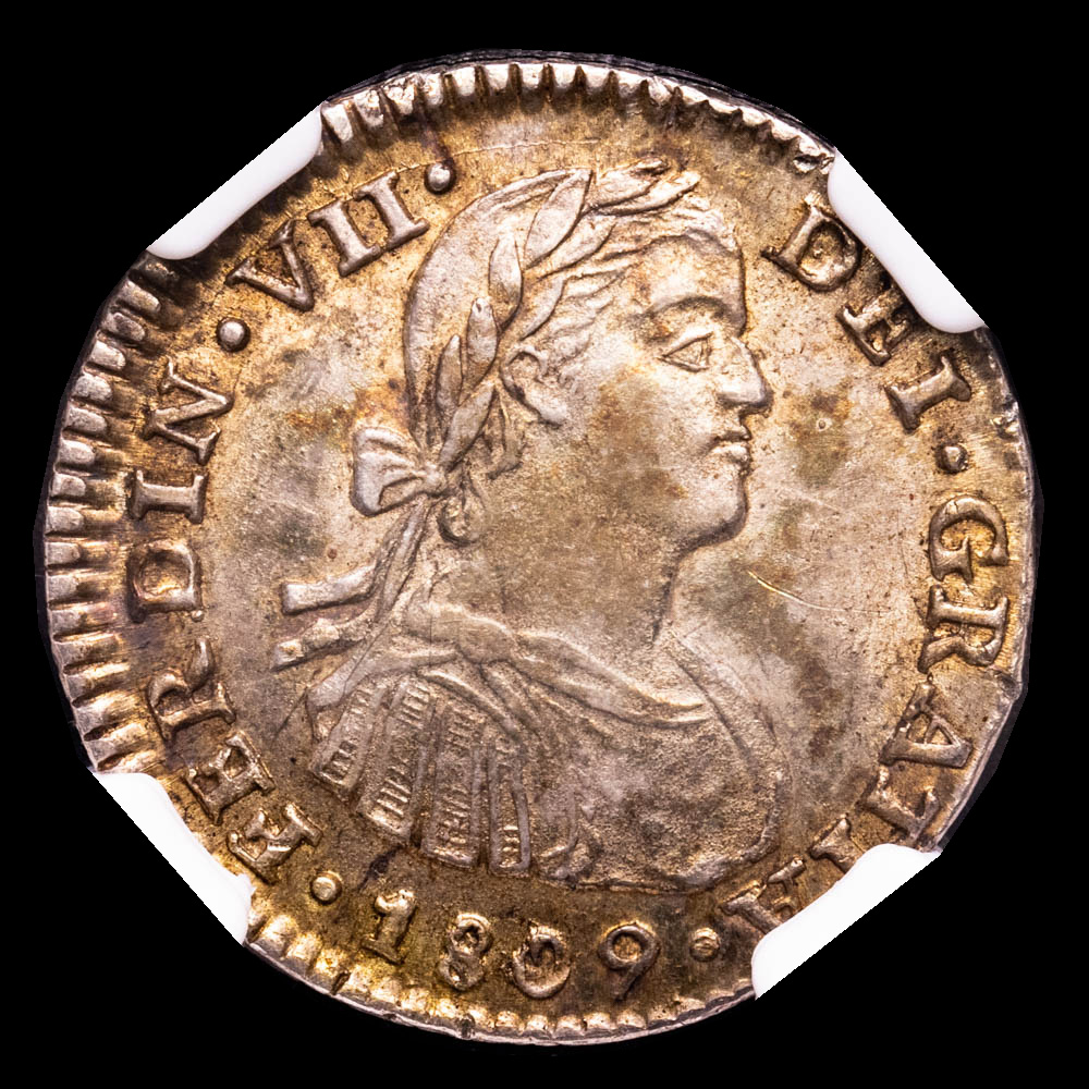 Fernando VII. Real. México. 1809. Ensayador T·H. Busto imaginario. Encapsulado por NGC AU 58.