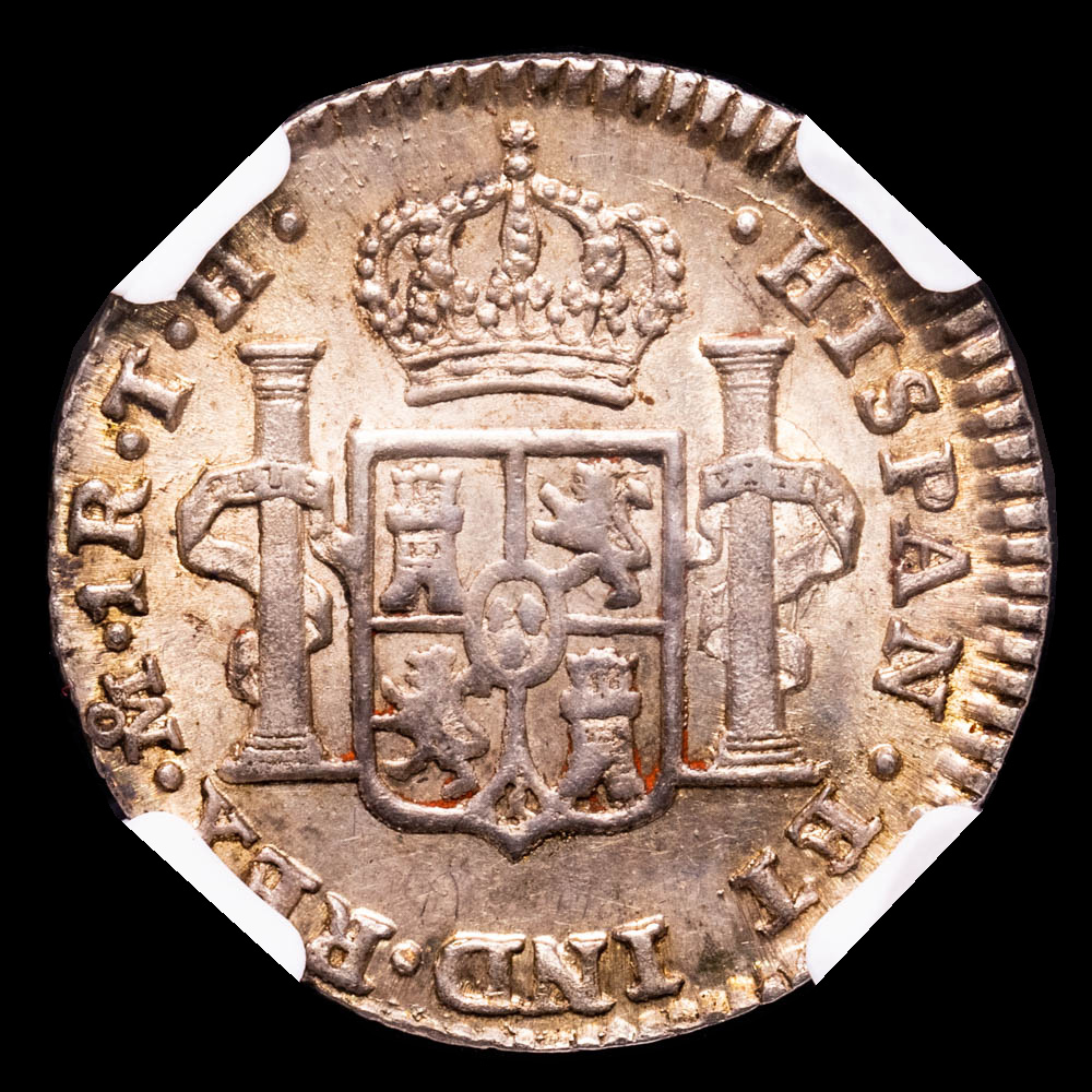 Numismática Barcala > Productos > Monarquia Española > Borbones > 1808-1833 Fernando VII > Fernando VII. Real. México. 1809. Ensayador T·H. Busto imaginario. Encapsulado por NGC AU 58.