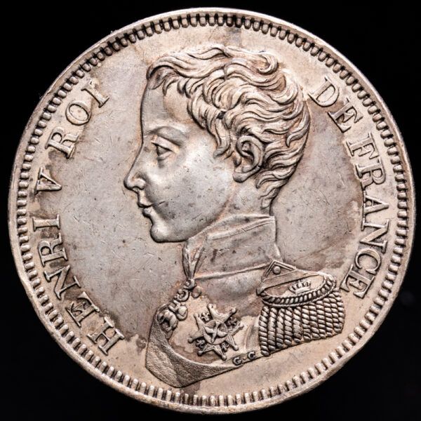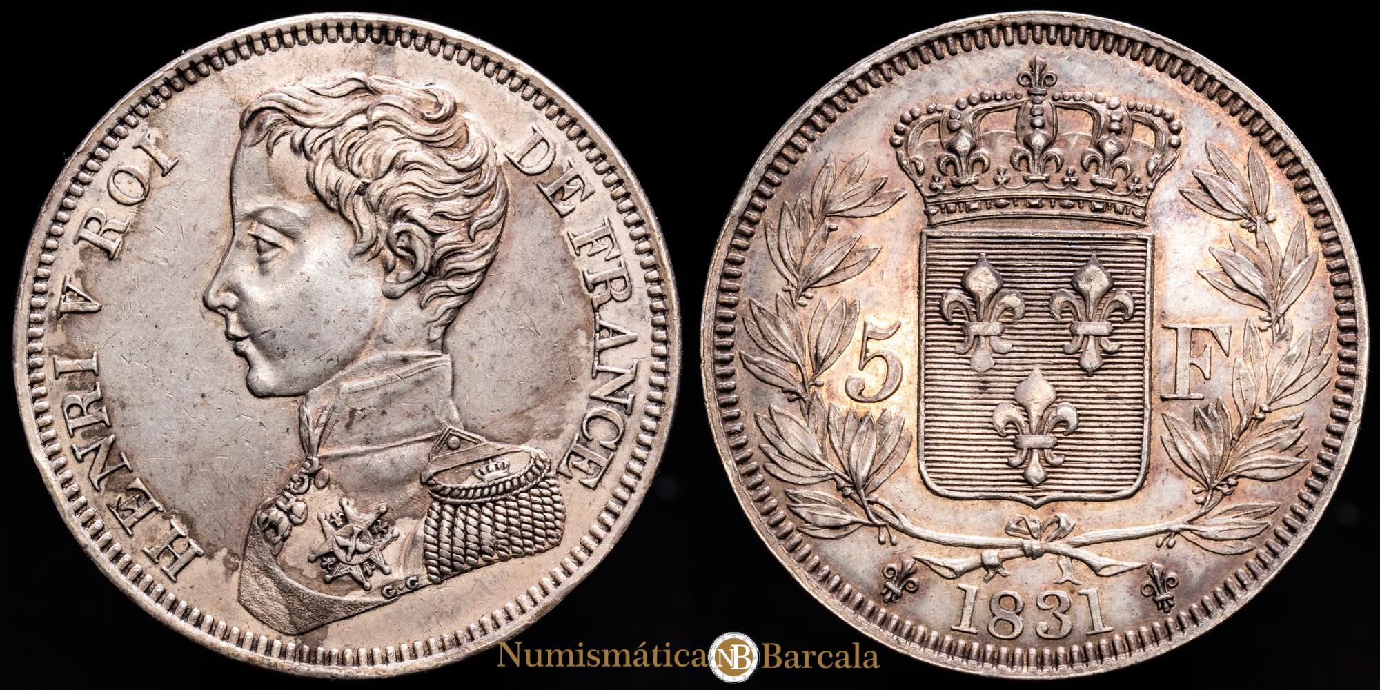 Numismática Barcala > Productos > Monedas Mundiales > Europa > Francia > Francia – Enrique V. 5 Francs. (24,63 g.). 1831. KM-35. UNC-. Restos de brillo original. Hermosa pátina.