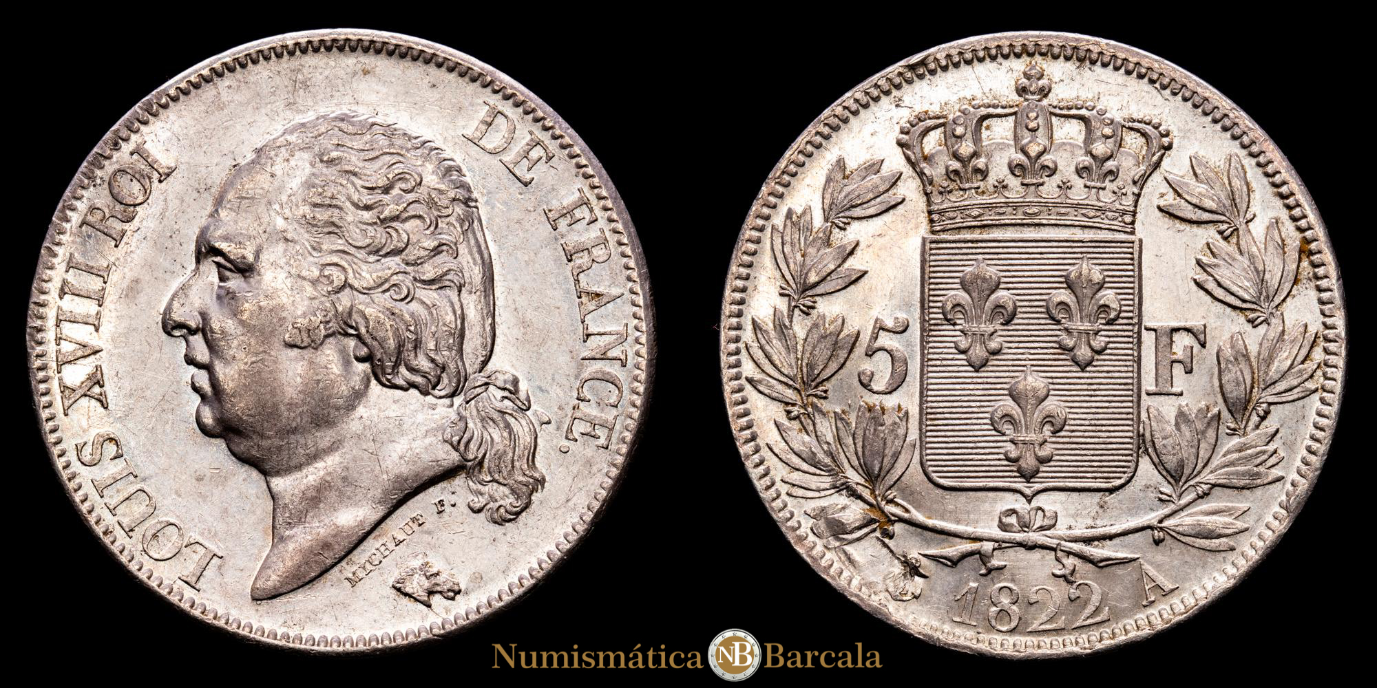 Francia – Louis XVIII. 5 Franc. (25,04 g.). Lille. 1822. F.309/73. EBC+. Brillo original.