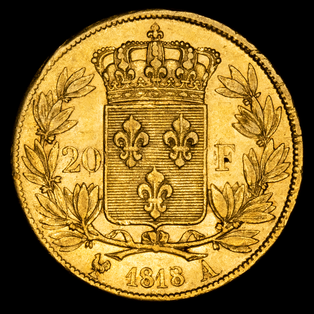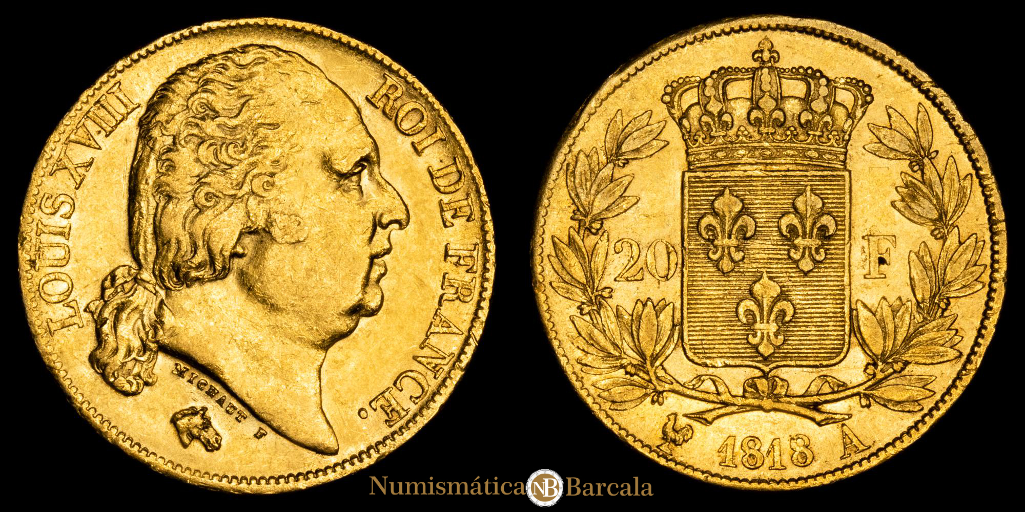 Numismática Barcala > Productos > Monedas Mundiales > Europa > Francia > Francia – Luis XVIII. 20 Francos. (6,45g.). París. 1818. Ensayador A. KM-712.1. XF. Restos de brillo original.