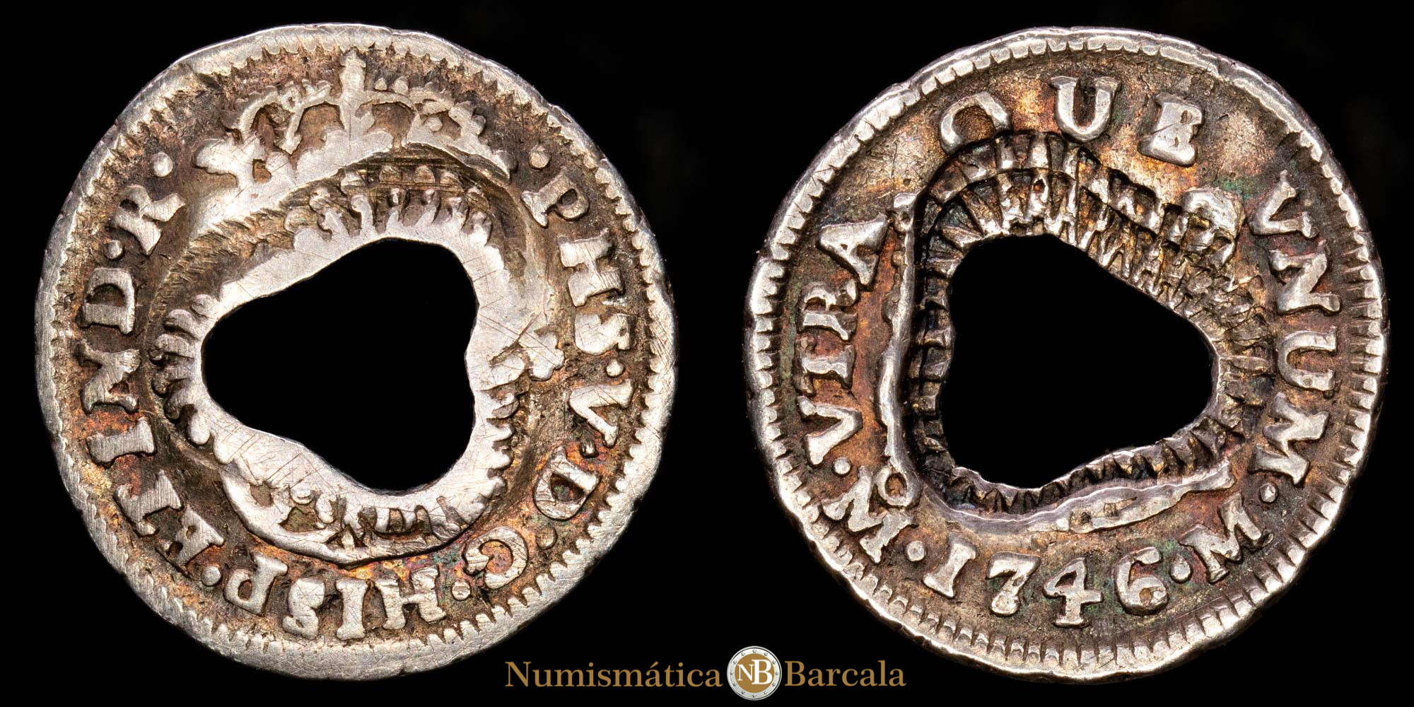 Numismática Barcala > Productos > Monarquia Española > Borbones > 1700-1746 Felipe V > Gibraltar – Felipe V. 1/2 Bit. (1,33 g.). México. 1746. Ensayador M. VG 20. Rara. T-1 Heart cut on 1/2 Real