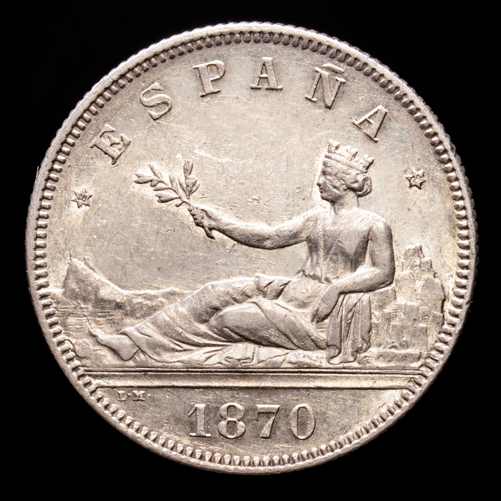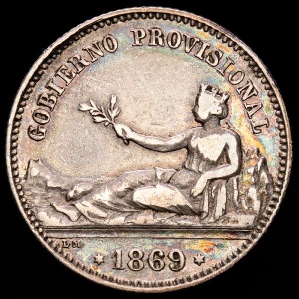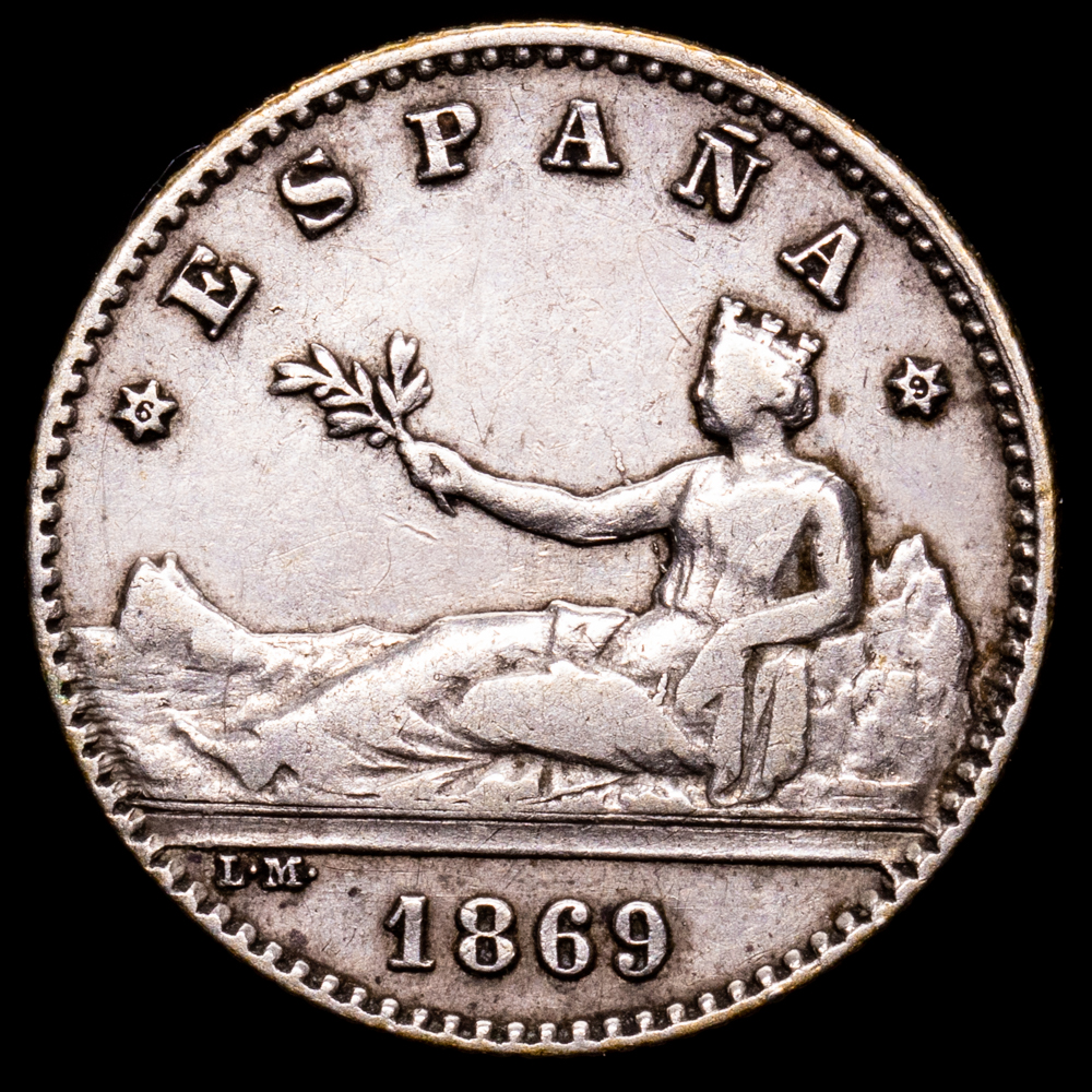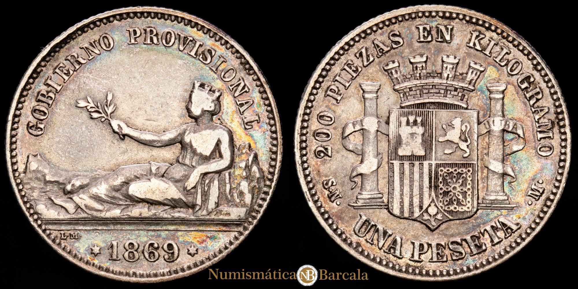 Numismática Barcala > Productos > Monarquia Española > Centenario > 1868-1871 Gob. Provisional > Gobierno Provisional. 1 Peseta. (4,99 g.). Madrid. 1869. Ensayador SN·M. AC-16. MBC-.