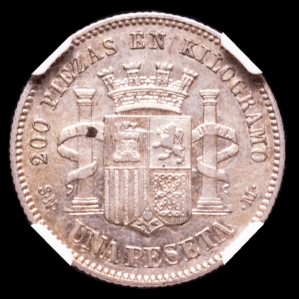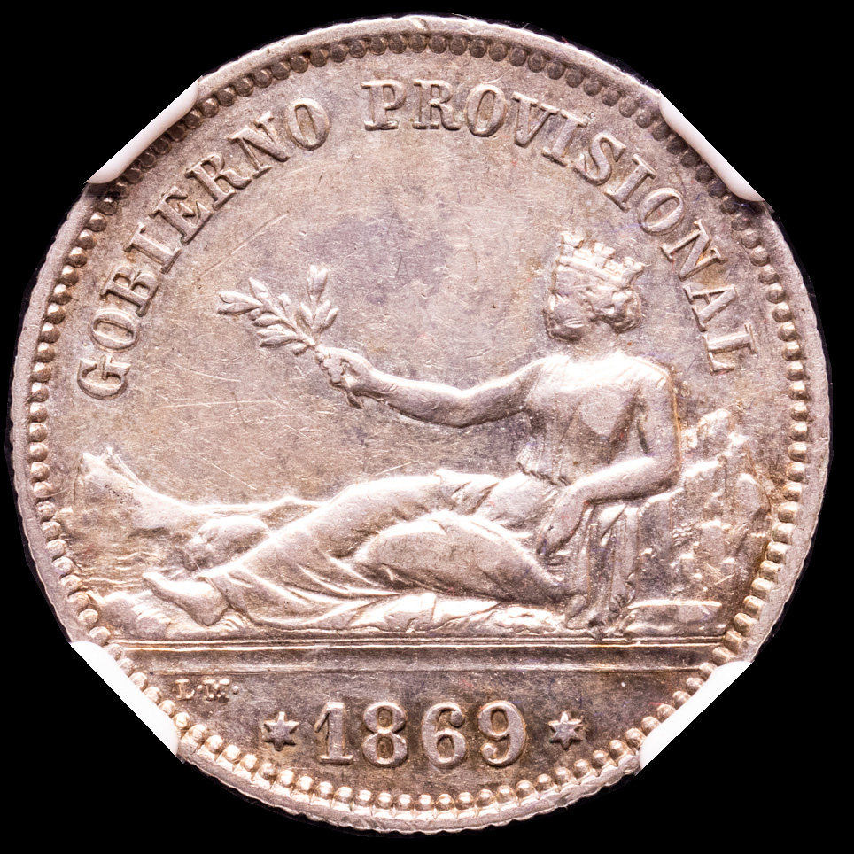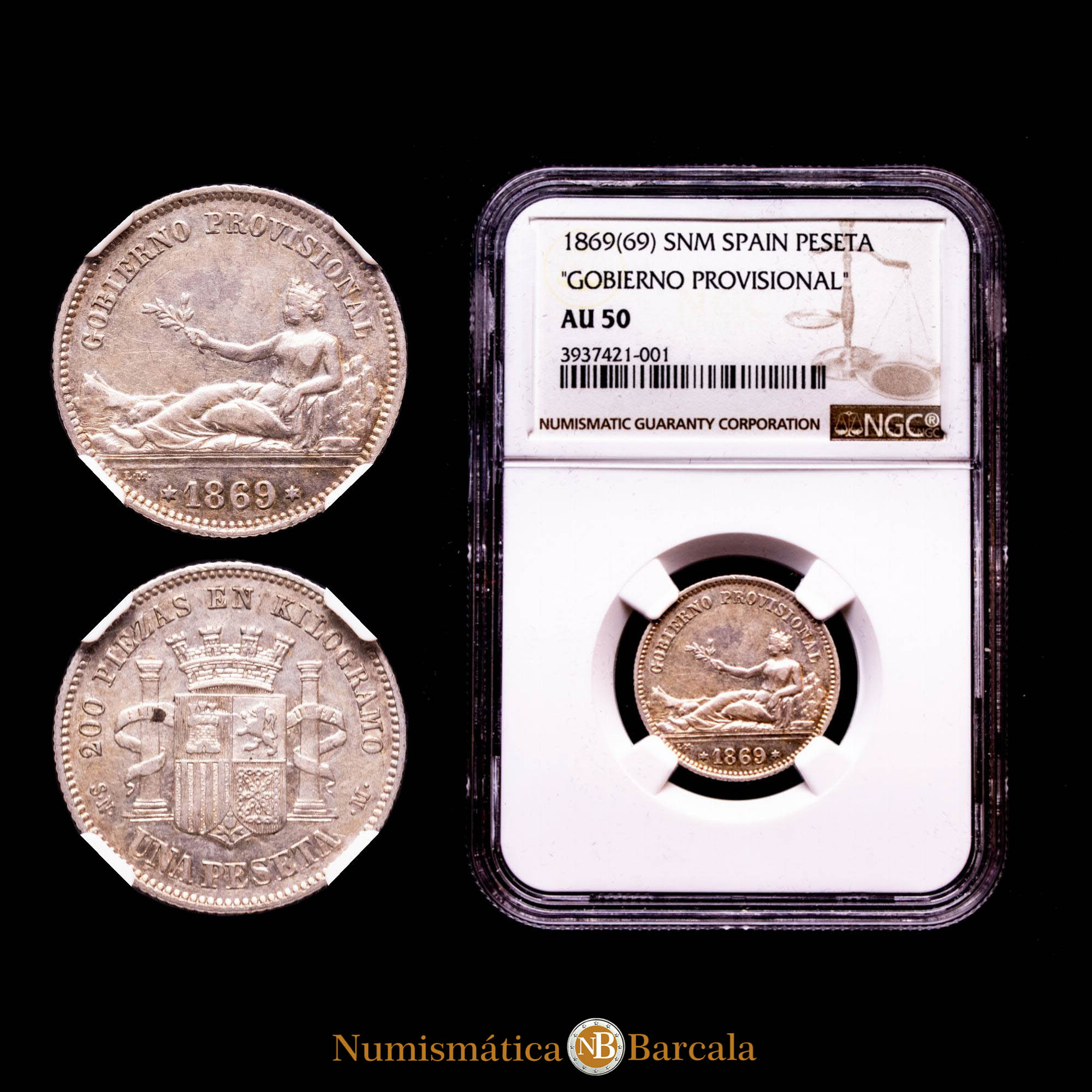 Gobierno Provisional. 1 Peseta. ( g.). Madrid. 1869(69). Ensayador SN·M. Encapsulado por NGC AU 50.