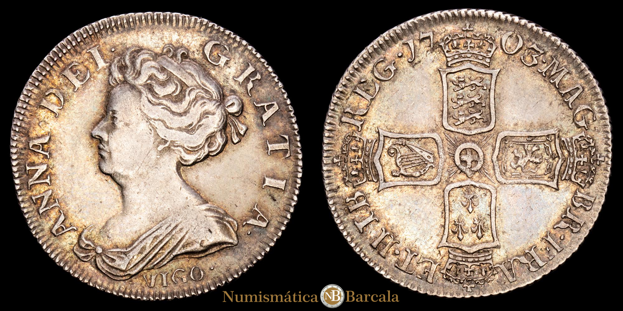 Numismática Barcala > Productos > Monedas Mundiales > Europa > Inglaterra > Gran Bretaña – Ana. Chelin. (5,99 g.). Vigo. 1703. SPINK-3586. MBC+. Escaso. Buen tono.