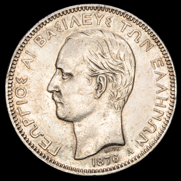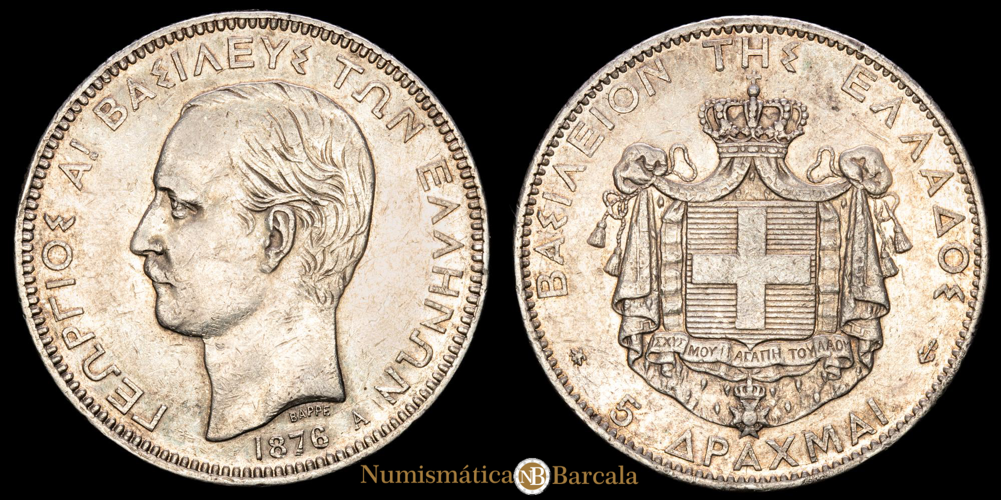 Numismática Barcala > Productos > Monedas Mundiales > Europa > Grecia > Grecia – Jorge I. 5 Dracmas. (25,03g.). París. 1876. Ensayador A. KM-46. XF+.