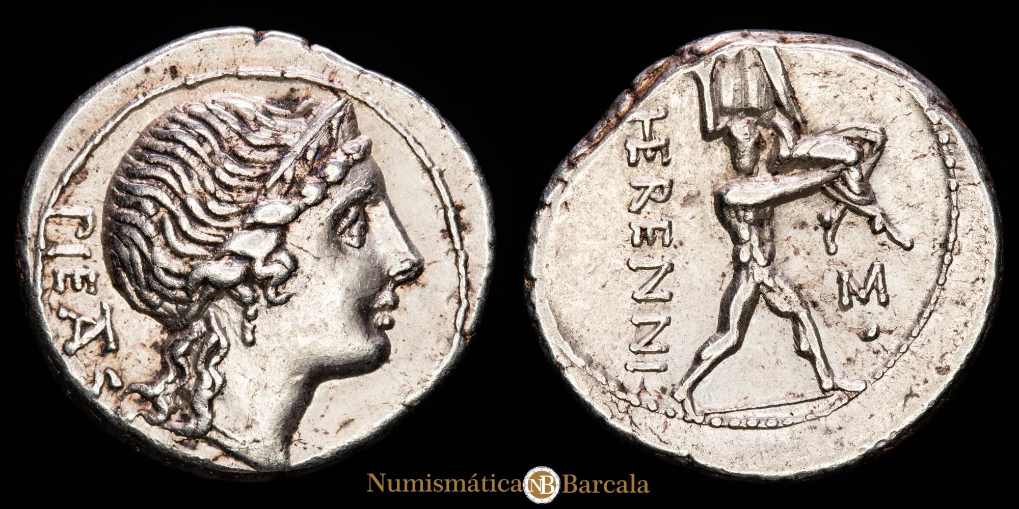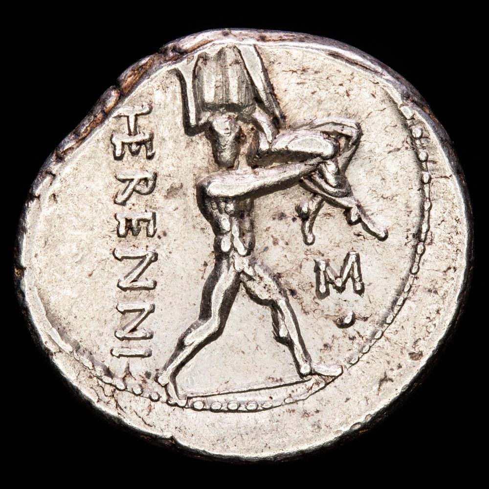Numismática Barcala > Productos > Romanas > REPÚBLICA > HERENNIA. Marcus Herennius. Denario (3,91 g.). Roma, 108-107 a.C. Rev.: Letra M sobre punto. BMC-1258-85; Cal-616; Craw-308/1b; FFC-745; Se-1a. EBC-.