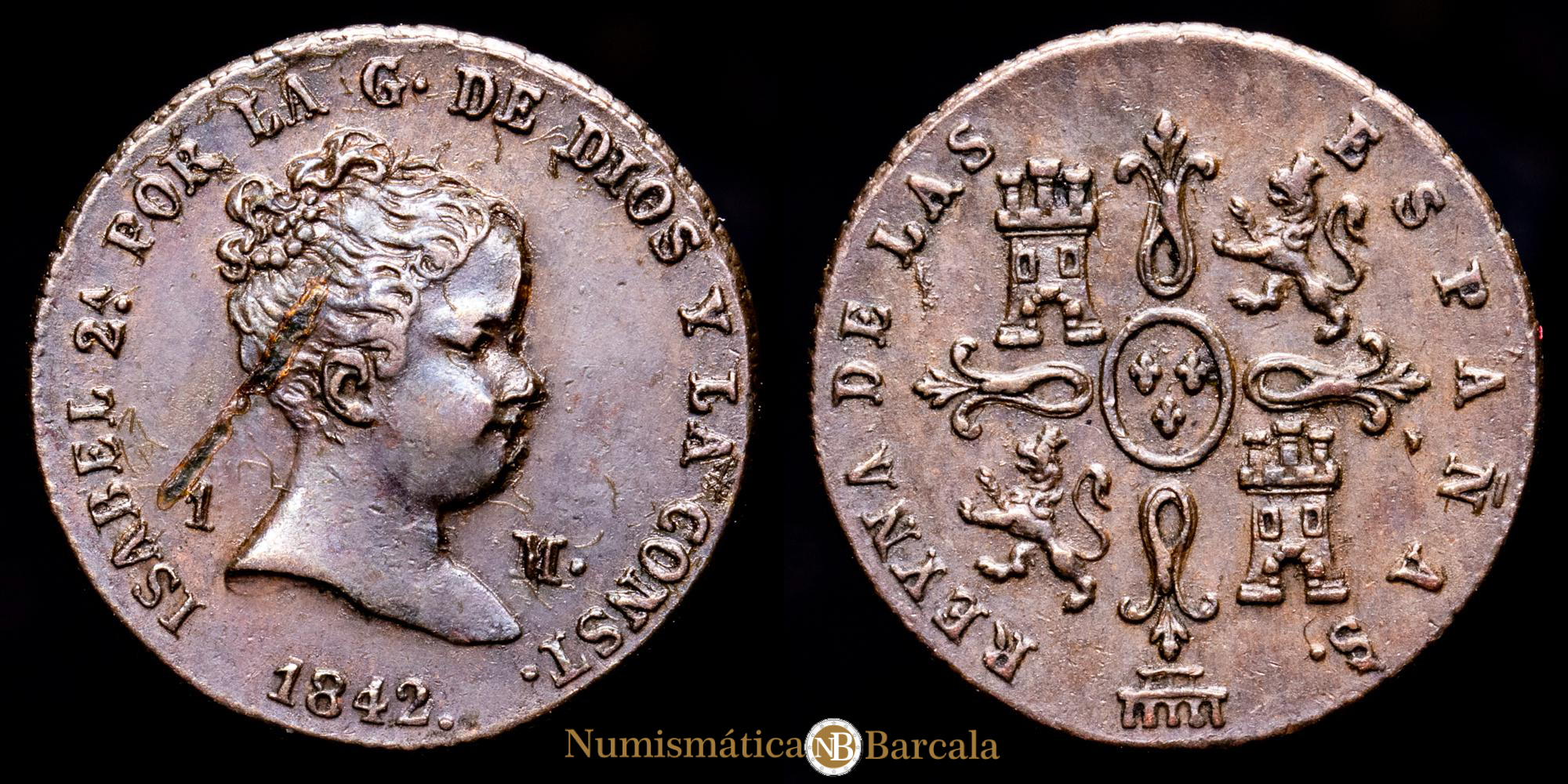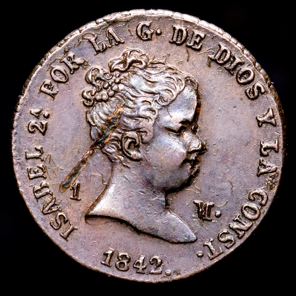 Numismática Barcala > Productos > Monarquia Española > Borbones > 1833-1868 Isabel II > Isabel II. 1 Maravedí. (1,42 g.). Segovia. 1842. CA-35. EBC+. Exceso de metal