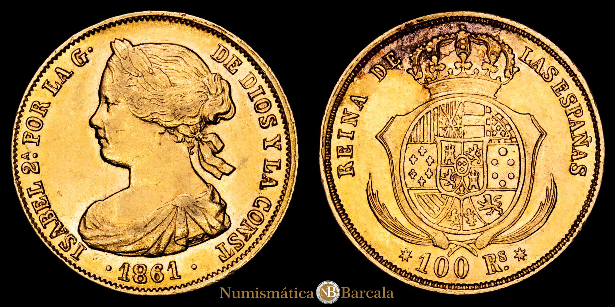 Numismática Barcala > Productos > Monarquia Española > Borbones > 1833-1868 Isabel II > Isabel II. 100 Reales. (8,39 g.). Sevilla. 1861. Aureo y Calicó – 804. SC-. Brillo original.