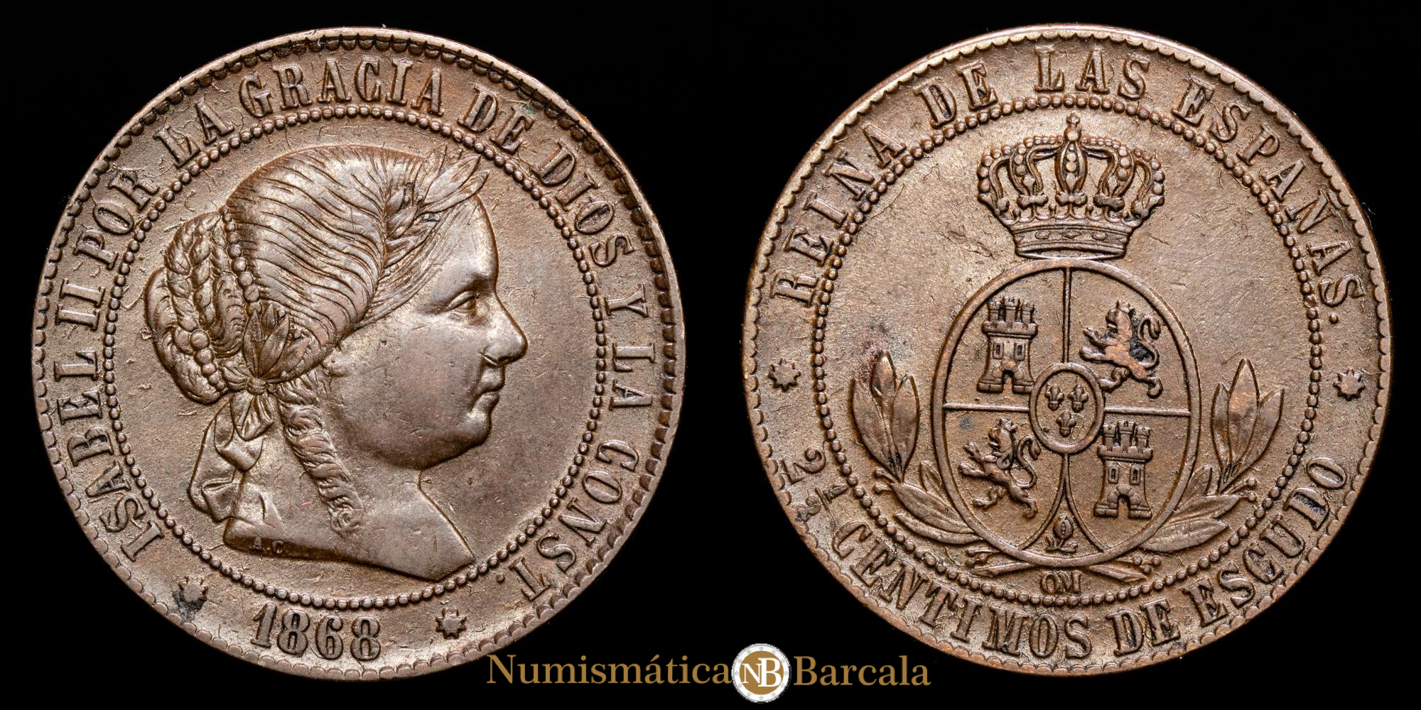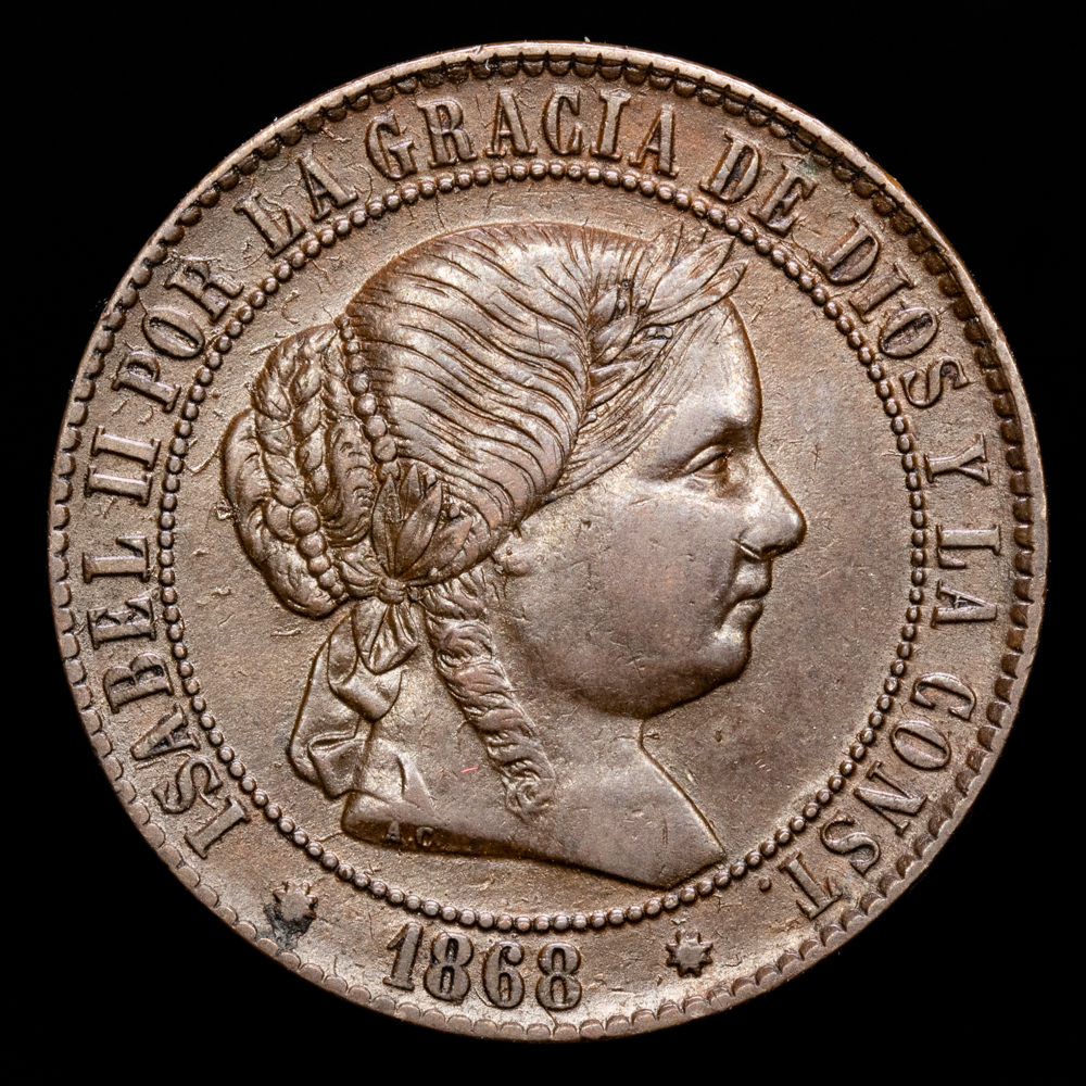 Isabel II. 2 1/2 Céntimos (6,15 g.). 1868. Barcelona. Ensayador Q.M. CA-233. EBC.