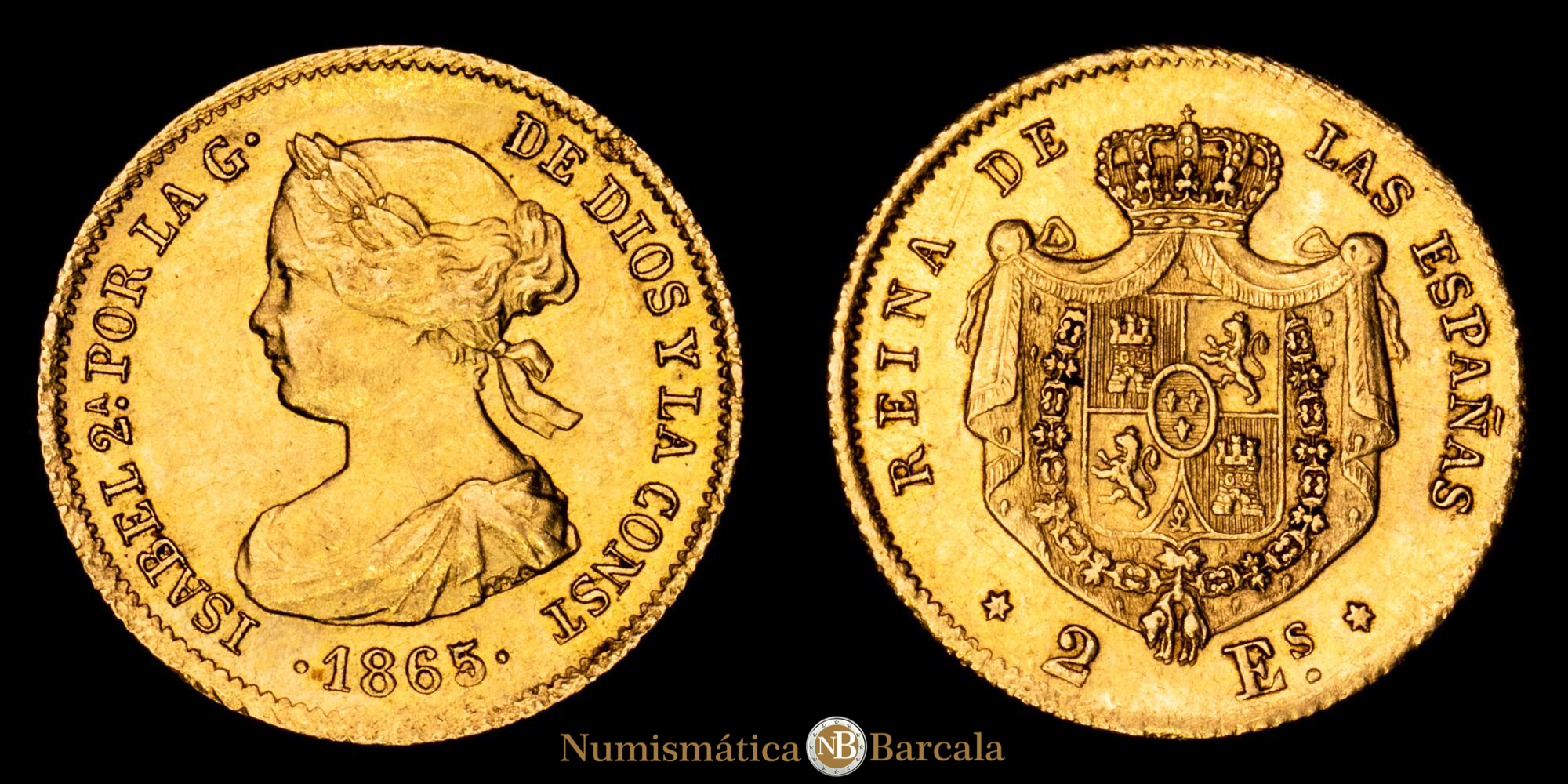 Numismática Barcala > Productos > Monarquia Española > Borbones > 1833-1868 Isabel II > Isabel II. 2 Escudos. (1,68 g.). Madrid. 1865/3. Aureo y Calico-PDF-674.1. MBC+/EBC-. Restos de brillo original. Rara con esta rectificación