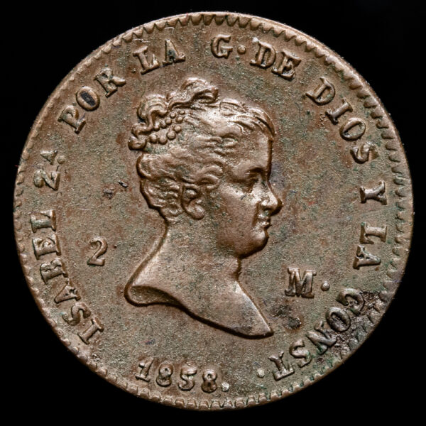 Isabel II. 2 Maravedís. (2,33g.). Barcelona. 1858. AC-37. SC. Muy rara en esta presentación!