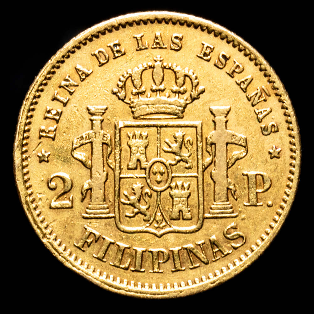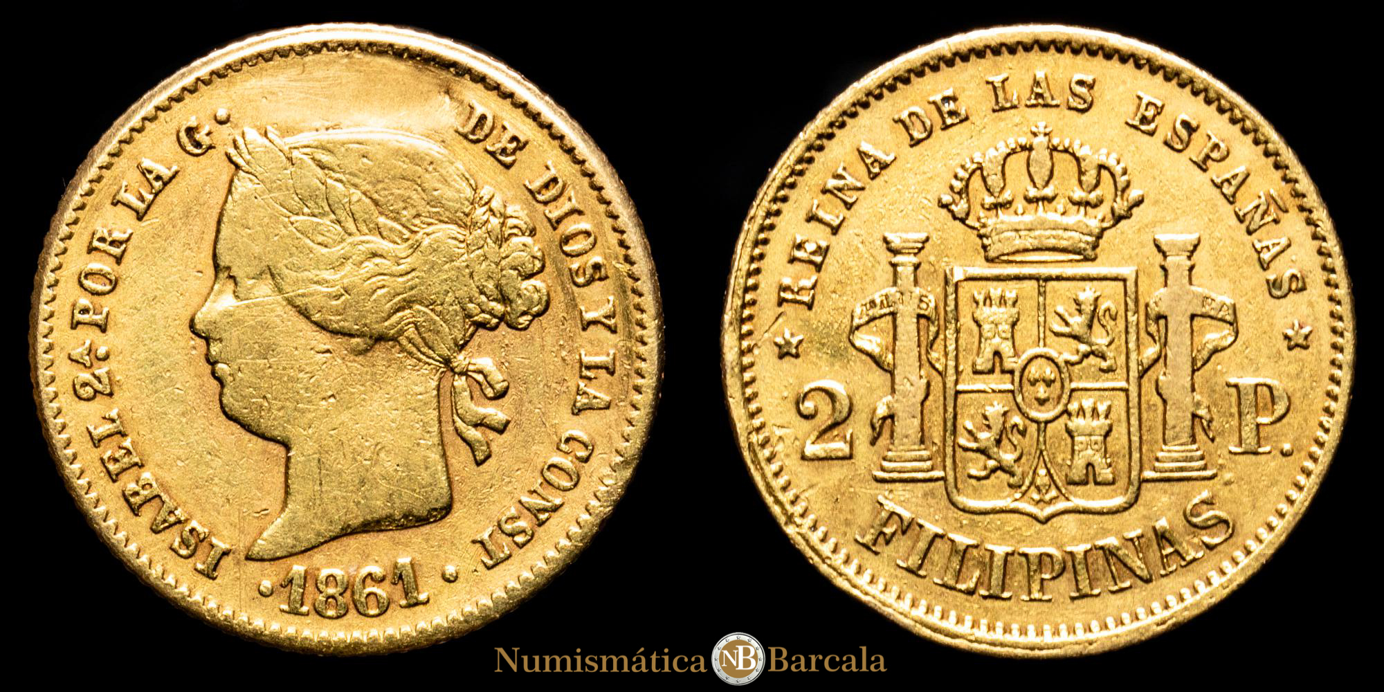 Numismática Barcala > Productos > Monarquia Española > Borbones > 1833-1868 Isabel II > Isabel II. 2 Pesos. (3,39 g.). Manila (Filipinas). 1861. Aureo y Calicó – 836. MBC.
