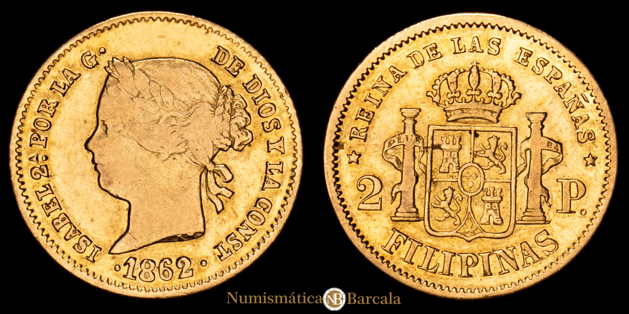 Numismática Barcala > Productos > Monarquia Española > Borbones > 1833-1868 Isabel II > Isabel II. 2 Pesos. (3,39 g.). Manila (Filipinas). 1862. AC-837. MBC+. Brillo original. Escasa.