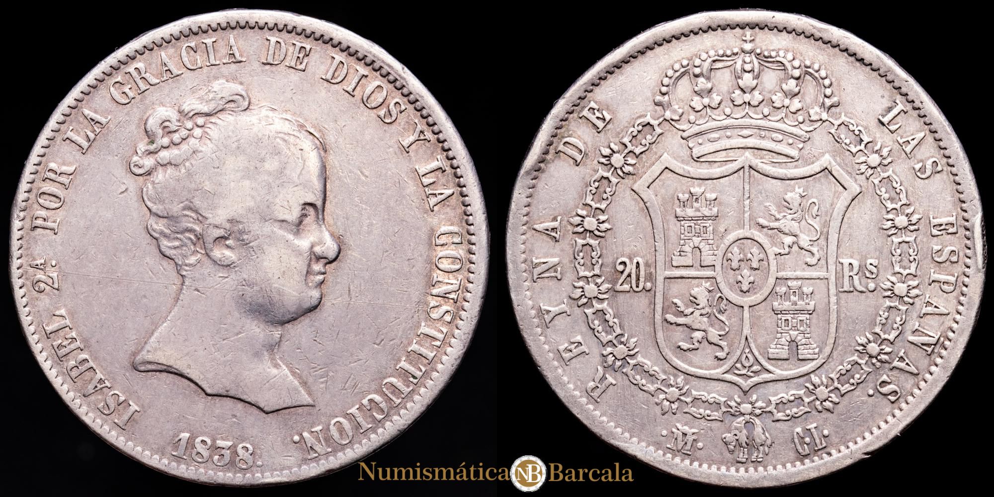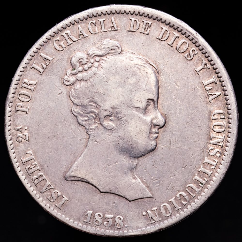 Isabel II. 20 Reales. (26,82 g.). Madrid. 1838. Ensayador C·L. AC-582. MBC-. Escasa