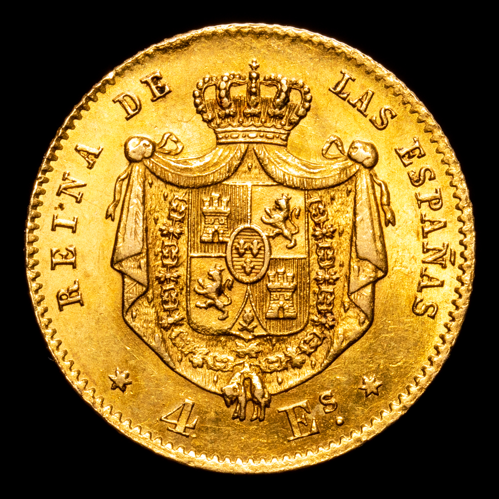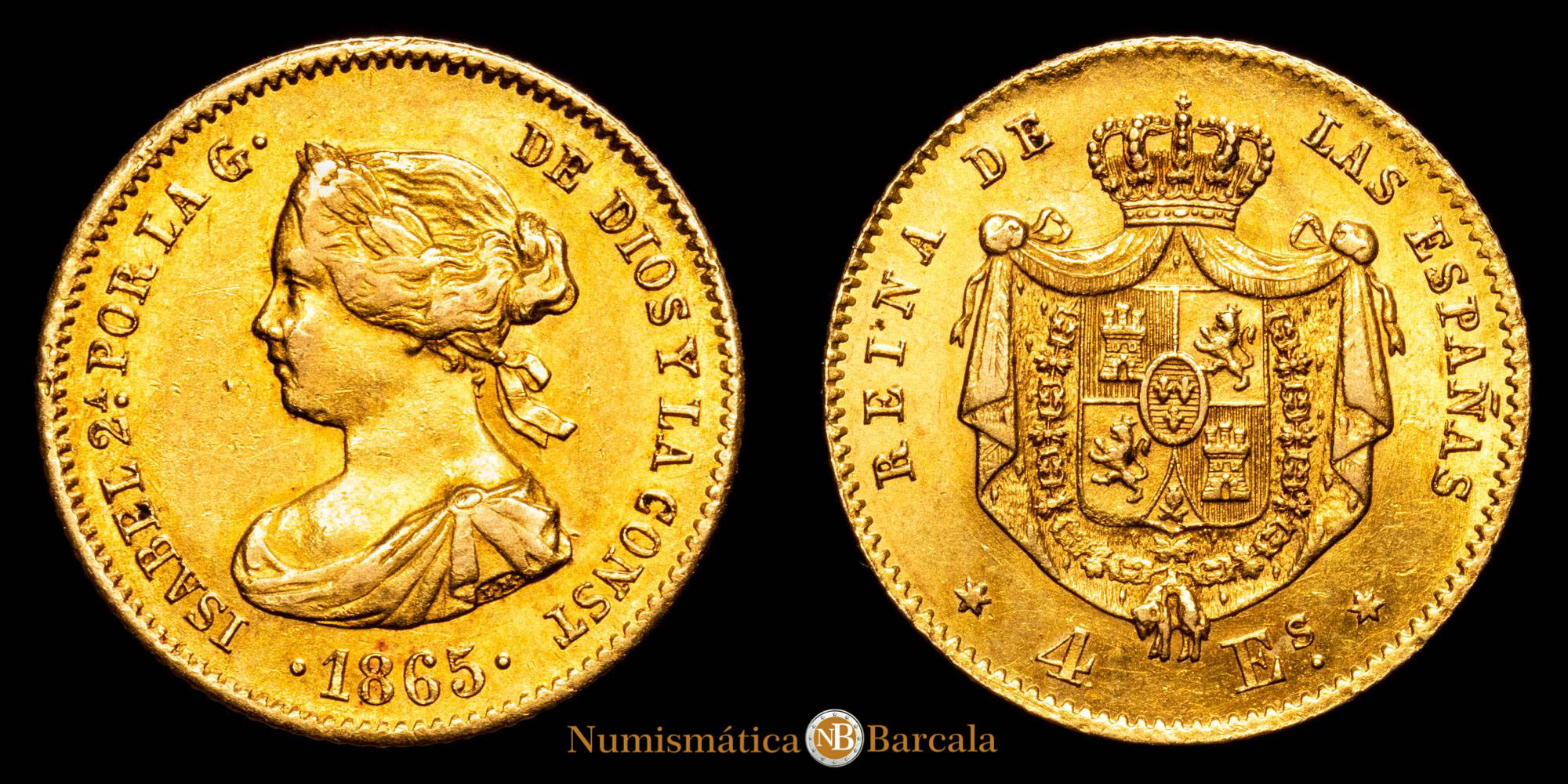 Numismática Barcala > Productos > Monarquia Española > Borbones > 1833-1868 Isabel II > Isabel II. 4 Escudos. (3,34 g.). Madrid. 1865. AC-688. XF+. Bello color