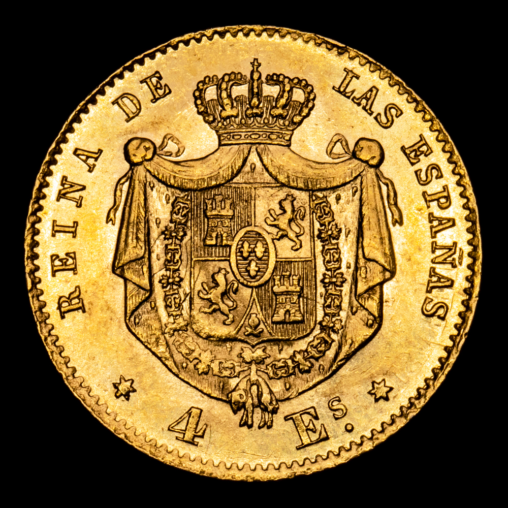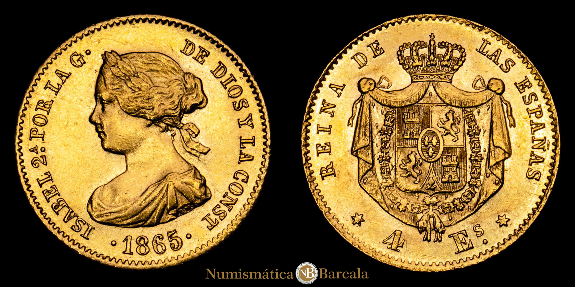 Numismática Barcala > Productos > Monarquia Española > Borbones > 1833-1868 Isabel II > Isabel II. 4 Escudos. (3,39 g.). Madrid. 1865. Aureo y Calicó – 688. EBC-. Brillo original