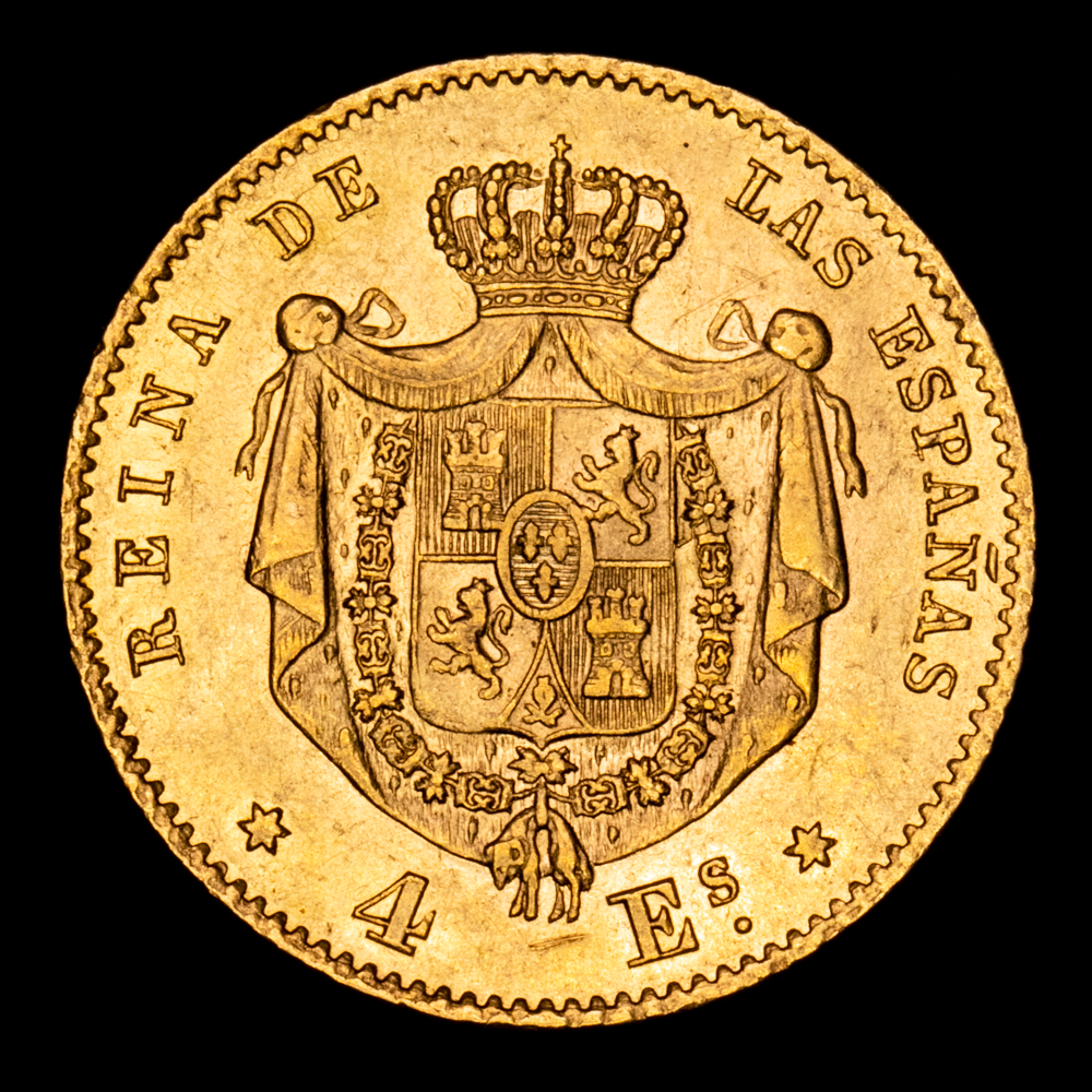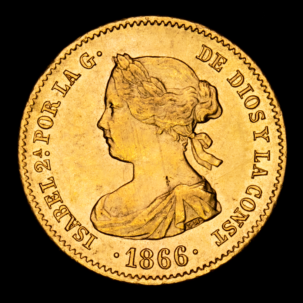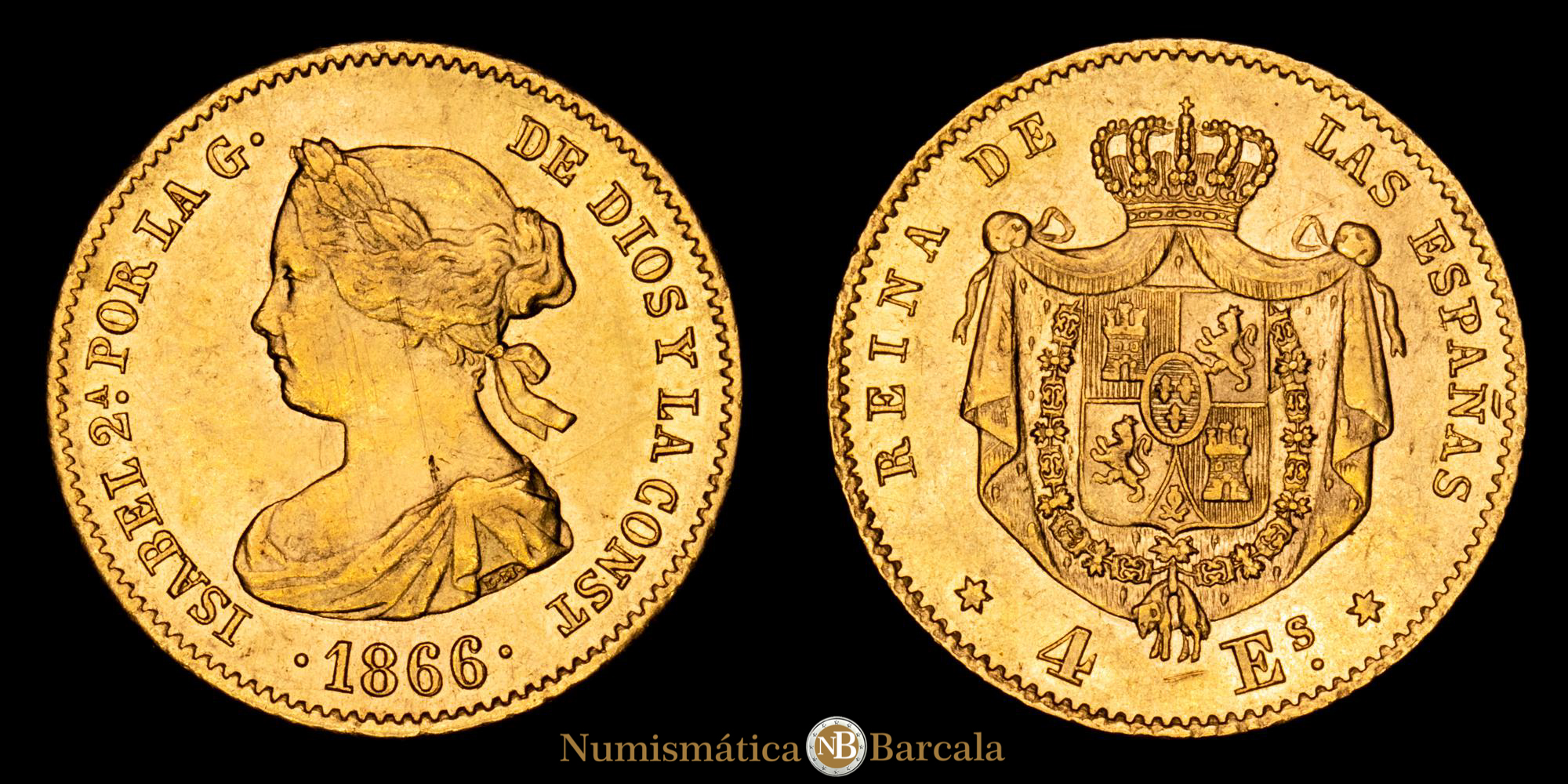 Numismática Barcala > Productos > Monarquia Española > Borbones > 1833-1868 Isabel II > Isabel II. 4 Escudos. (8,39 g.). Madrid. 1866. Aureo y Calico-689. MBC+. Tono.