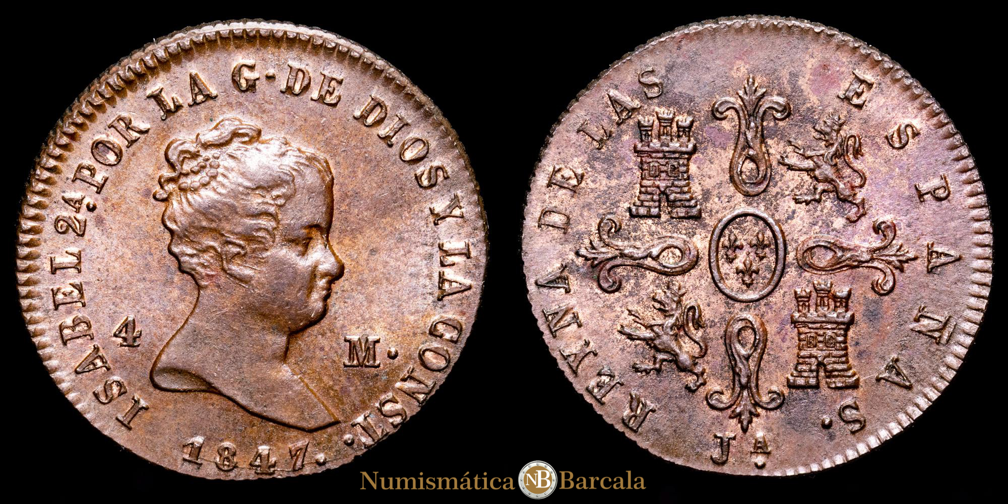 Numismática Barcala > Productos > Monarquia Española > Borbones > 1833-1868 Isabel II > Isabel II. 4 Maravedís. (5,42 g.). Jubia. 1847. AC-73. SC-. Restos de brillo original.
