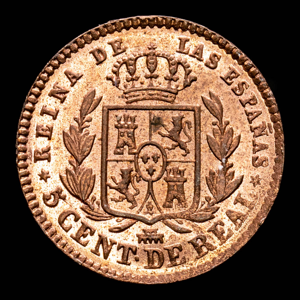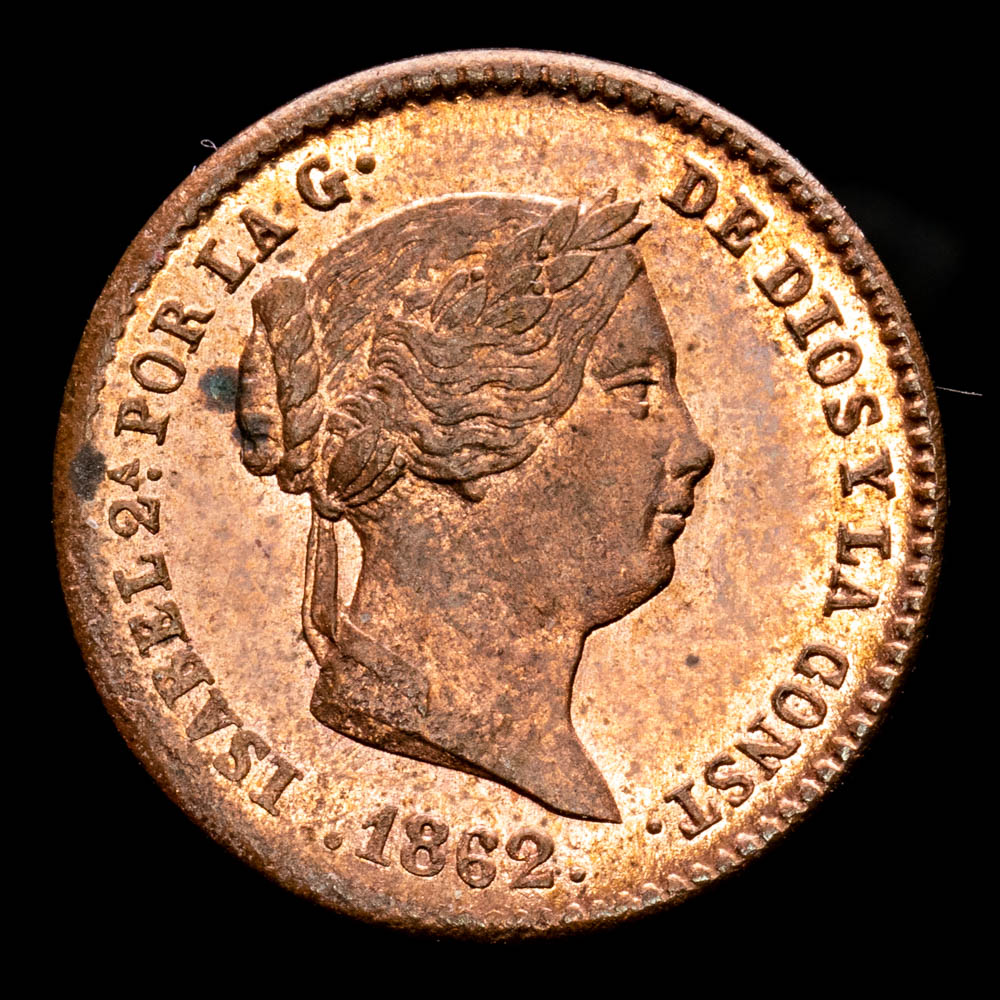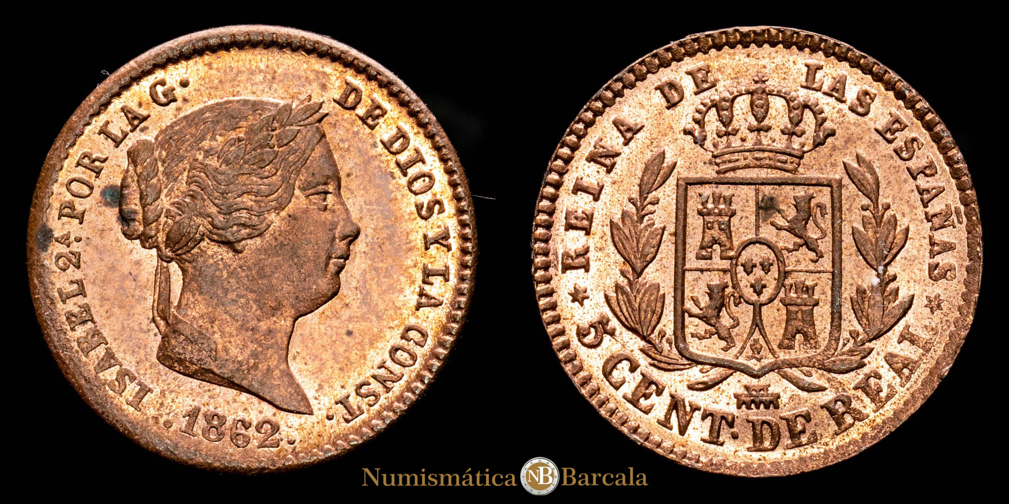 Numismática Barcala > Productos > Monarquia Española > Borbones > 1833-1868 Isabel II > Isabel II. 5 Céntimos de real. (1,86 g.). Segovia. 1862. Aureo y Calicó – 167. FDC. Brillo original. Sobervia presentación.
